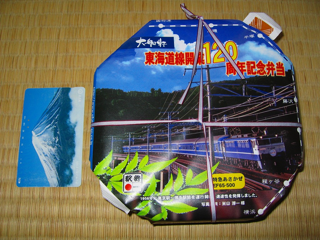 駅弁の名前のとおり、横須賀線の開業120周年を記念して、2009(平成21)年6月限りで販売された記念駅弁。浅く華奢(きゃしゃ)な正方形の容器に木目柄のボール紙でふたをして、横須賀線電車の加工写真かイラストかを印刷した掛紙を巻いて、ひもで十時にしばる。中身は日の丸俵飯にカレー風味の鶏照焼、ホタテやサトイモなどの煮物、ピンク色のしゅうまいと赤い漬物、「祝」焼き印の玉子焼など。いつもながらチープな大船駅の記念駅弁だけど、価格と分量と風味に不満は出ないし、掛紙の品質も良かった。