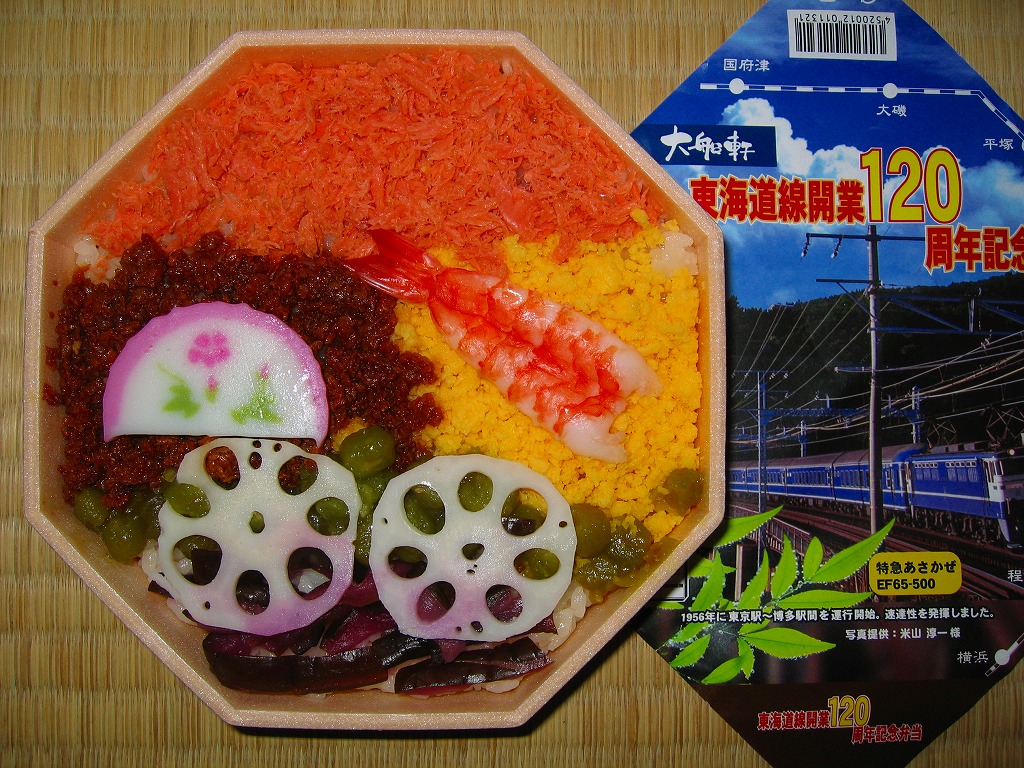 下記の記念駅弁「東海道線開業120周年記念弁当」の第3弾で、1956(昭和31)年に運行を開始した寝台特急列車「あさかぜ号」の写真を採用した。掛紙だけのチェンジなので、中身や価格は当然に同一。