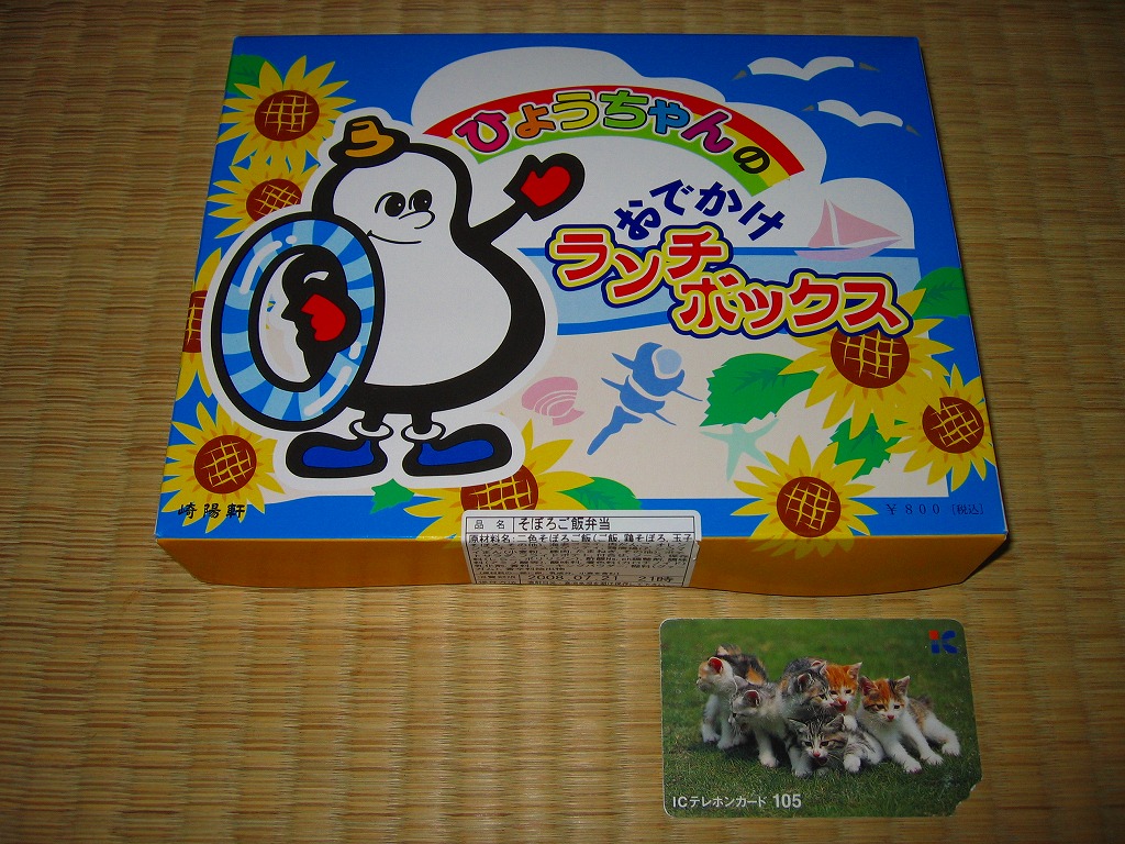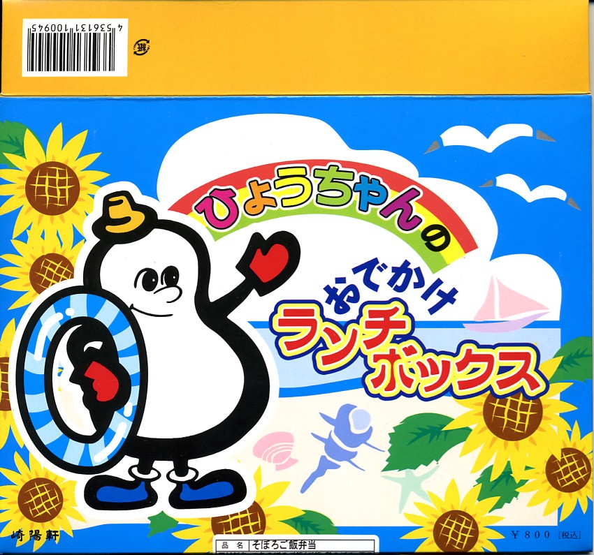 2008(平成20)年7月19日から8月24日まで新横浜駅で販売された期間限定駅弁。15個入り以上のシウマイに付いてくる磁器の醤油入れ「ひょうちゃん」をキャラクターにしたイラストを描くボール紙製の専用紙箱を使用、白いトレーに詰めた中身は、鶏の親子そぼろ御飯、エビフライ2本、肉団子、スパゲティ、鶏唐揚、ポテトサラダ、フライドポテト、ミニトマト、オレンジ、シウマイまん。