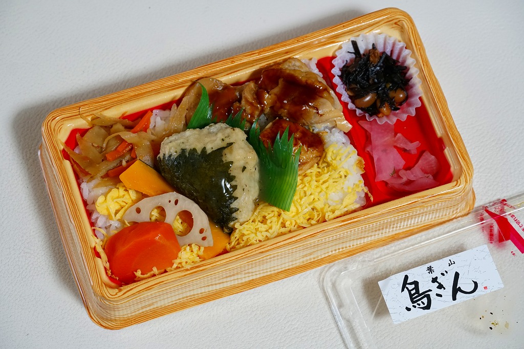 デパートの地下食品売り場やスーパーの惣菜売り場で見かける体裁で、ふたが透明なプラ容器に鶏昆布だし御飯を詰め、焼き鳥と鶏つくねに煮物や錦糸卵で覆い、ひじきと大根漬を添える。食べても惣菜の鳥弁当。