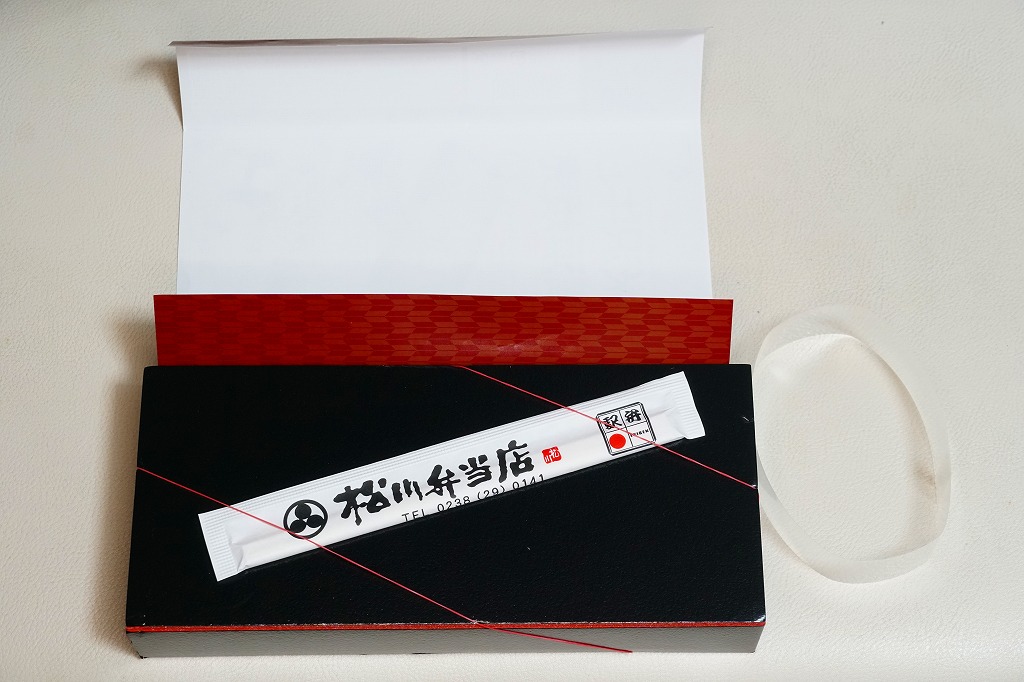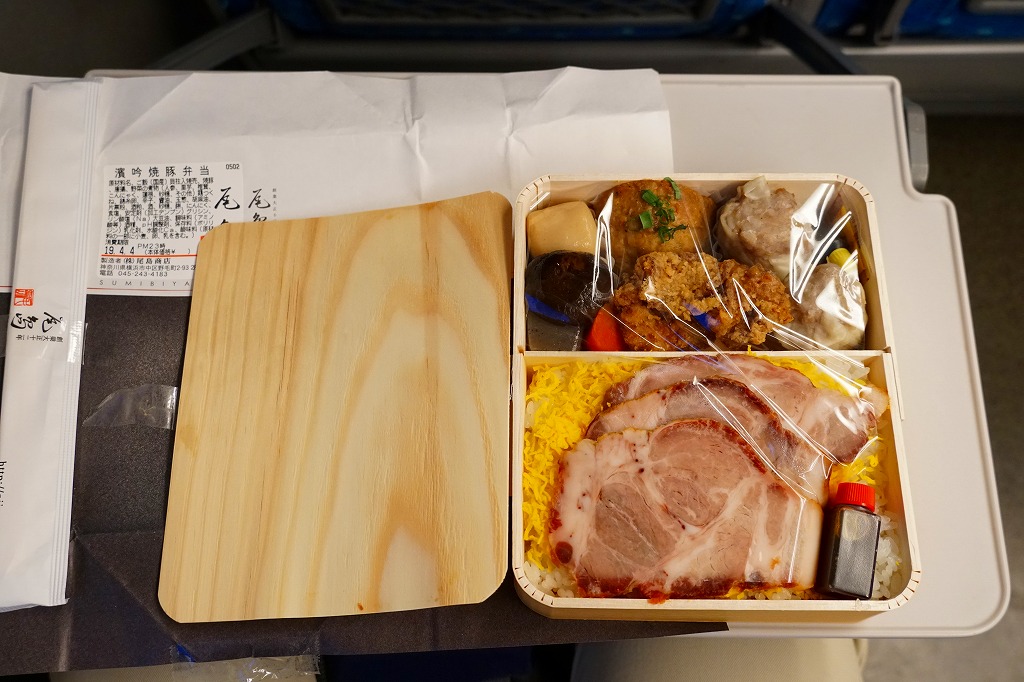 2009(平成21)年までには東京駅や羽田空港で登場していた模様。黒いプラ製トレーの容器に透明なふたをして、商品名と書いたオレンジ色の掛紙を巻く。中身は白御飯の上を「和豚もちぶた」の照り煮なる豚肉で覆い、タマネギ煮とシシトウ、玉子焼と大根桜漬を添えるもの。内容のシンプルさと分量が心地良く、しかし冷めた状態で食べる味ではないとも思う。