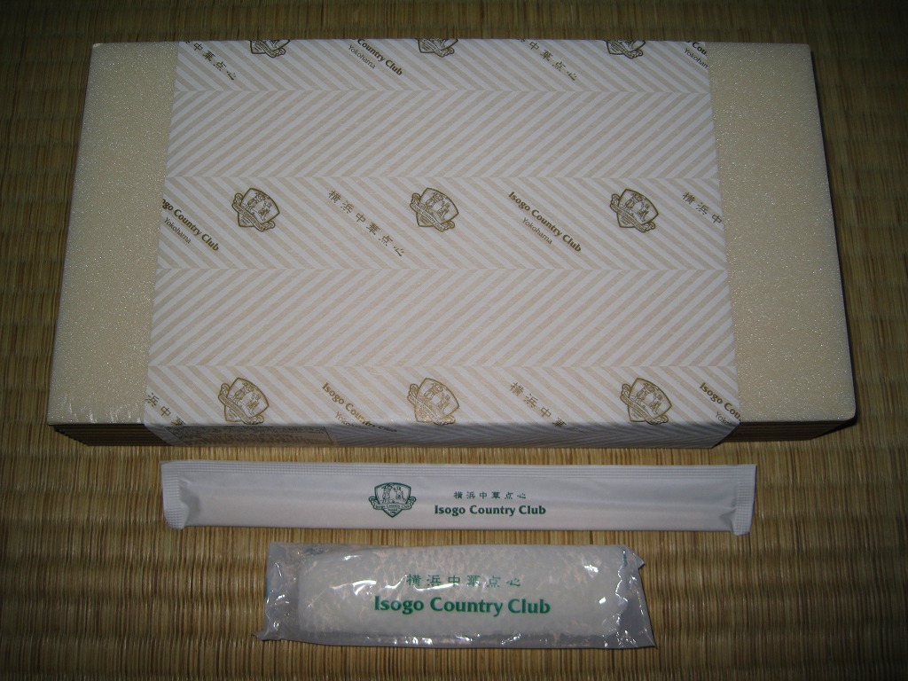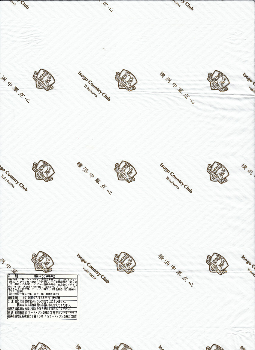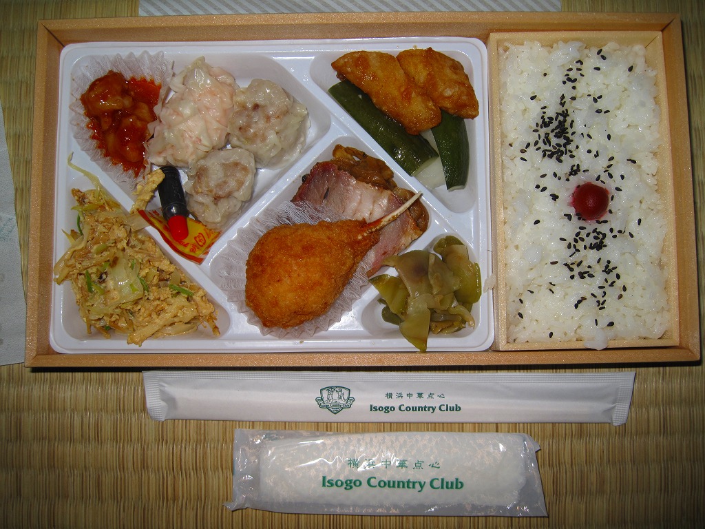 新横浜駅ビルの食品フロアで販売されていたお弁当。長方形のしっかりした容器に、「横浜中華点心」や「Isogo Country Club Yokohama」の文字を記した包装紙を巻く。中身は内蔵容器に収まる日の丸御飯と、白いトレーに収まるシュウマイ、海老包み蒸し、カニ爪フライ、干し貝柱の卵炒め、ごぼうとれんこんの炒め物、白身魚マリネ、エビチリ、チャーシュー、大根とキュウリの甘酢、ザーサイ。