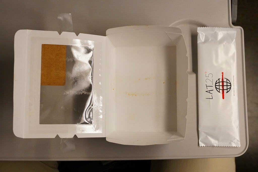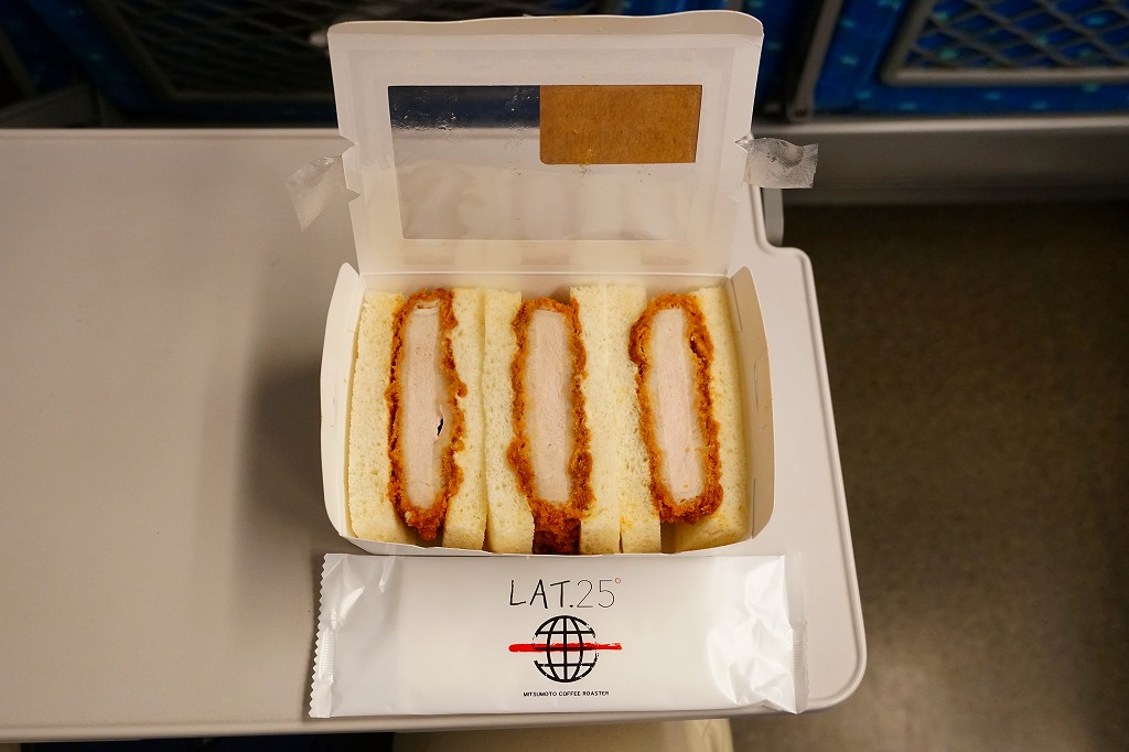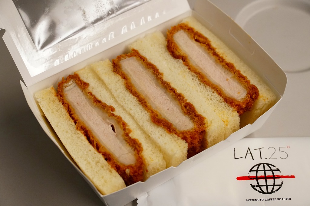 新横浜駅の新幹線改札内の待合室で、2017(平成29)年5月31日にリニューアルオープンした店舗「LAT.25」で売られる箱入りサンドイッチ。窓がある白い紙箱に、端整なロースカツを軽めのソース漬けにして、耳なし食パンに挟んだものを3切れ収めた。商品が機能的あるいは売り場的にサンドイッチ駅弁と同じ存在であることと、横浜創業の三本コーヒーが空港と東海道新幹線駅に展開する店舗であることから、ここに収蔵。商品の調製元そのものは、東京都江戸川区のホールセールベーカリー。