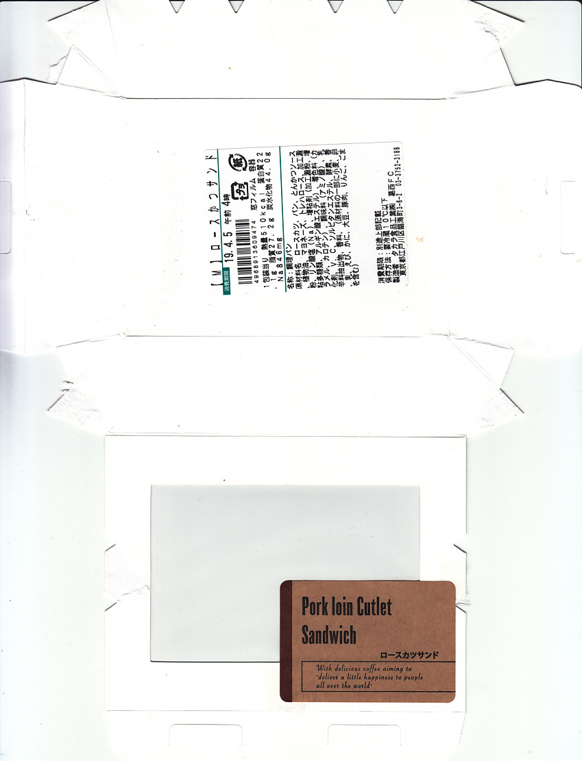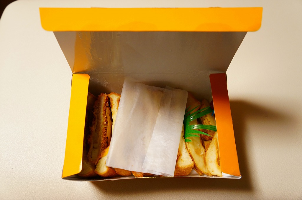 2012(平成24)年頃から新横浜駅構内、厳密には駅ビルあるいは交通広場の一角での台売りを始めた商品のひとつ。オレンジ色で大きめな専用紙箱に、トーストした食パンにチーズやタマネギやロースカツを挟んだカツサンドを3切れと、ポテトフライを直に詰める。バターのような脂身とトーストされた食パンで個性がある。同じ調製元のトンカツ弁当より高価な価格設定と、上記3点をまとめて同じ場所で購入したのに、体裁も内容も風味も同じ業者の製造販売とは思えないような三者三様が、興味深かった。2023年に新横浜駅の店舗が閉店したようで、今は駅では買えない。
