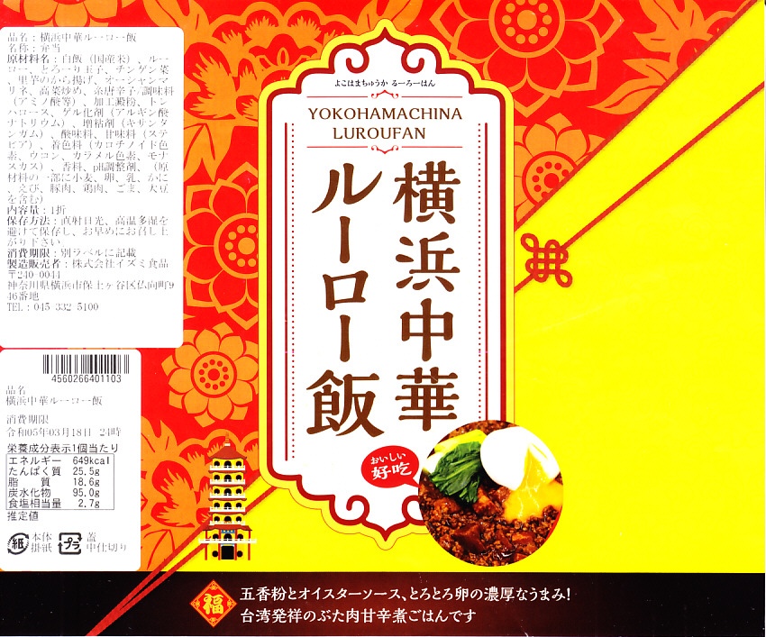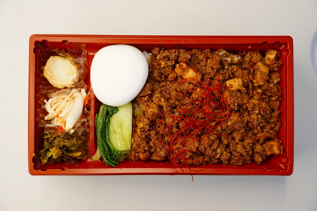 新横浜駅では2023(令和5)年の春までに発売か。調製元は2010年前後に横浜駅や新横浜駅あるいは東京都内で売られた「横濱牛めし」などで見た名前。駅では久々に出会えたと思う。つくりは新横浜駅で買える崎陽軒やジェイアール東海パッセンジャーズなどの駅弁と同じ感じで、商品名を描いた掛紙を巻いた長方形のプラ容器に、白飯を敷いて豚バラ肉のミンチ「ルーロー」で覆い、半熟卵のようなもの、チンゲンサイ、サトイモの唐揚げ、キャベツのマリネ、高菜炒めを添える。五香粉などで台湾料理の香り豊かで、お肉もたっぷりで、駅弁屋の弁当に負けず常温でおいしい豚丼。年内で終売か。