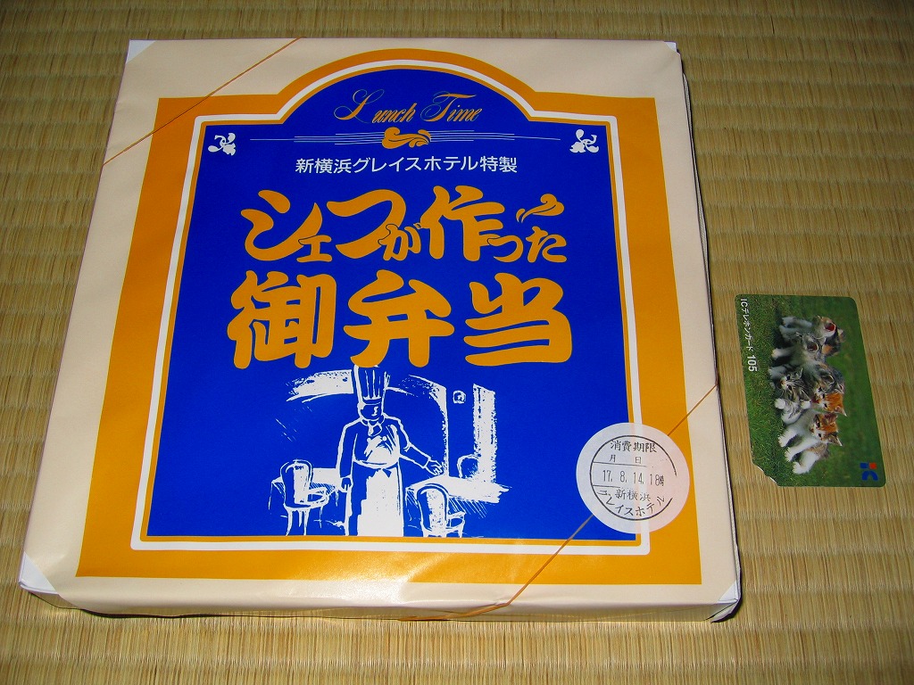 新横浜の駅前ホテルが調製する、知る人ぞ知る隠れた新横浜駅弁の元祖。事務的に白い大きな正方形のボール紙箱を、青バージョンの大きな掛紙で包み、事務用輪ゴムで留めて調製印シールを貼る。中身は俵型日の丸御飯、蒲鉾と焼鮭と煮物、海老フライとカニ爪フライにハムとパスタなどの、和洋折衷幕の内駅弁。
