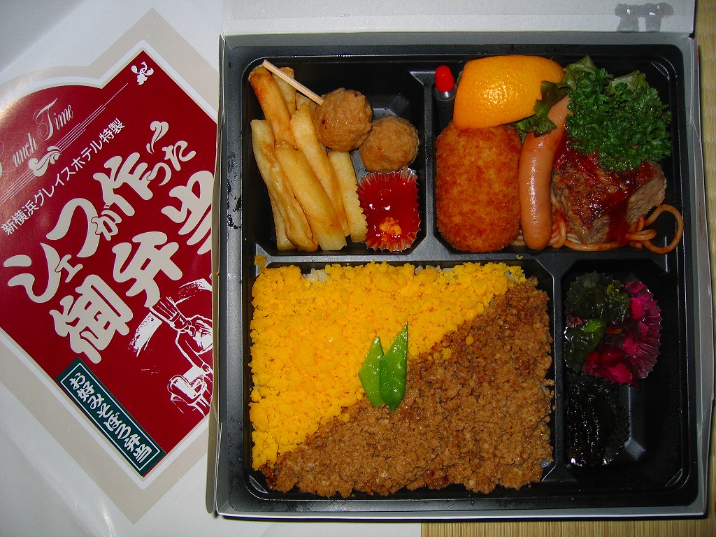 新横浜の駅前ホテルが調製する、知る人ぞ知る隠れた新横浜駅弁で、さらにマイナーな別バージョン。事務的に白い正方形のボール紙箱を赤バージョンの掛紙で包む。中身は玉子そぼろと豚そぼろの御飯に、ステーキのような鶏唐揚、ウインナー、フライドポテト、クリームコロッケなど。ホテルのブッフェな雰囲気と風味を感じる。