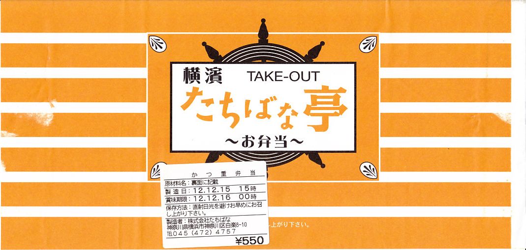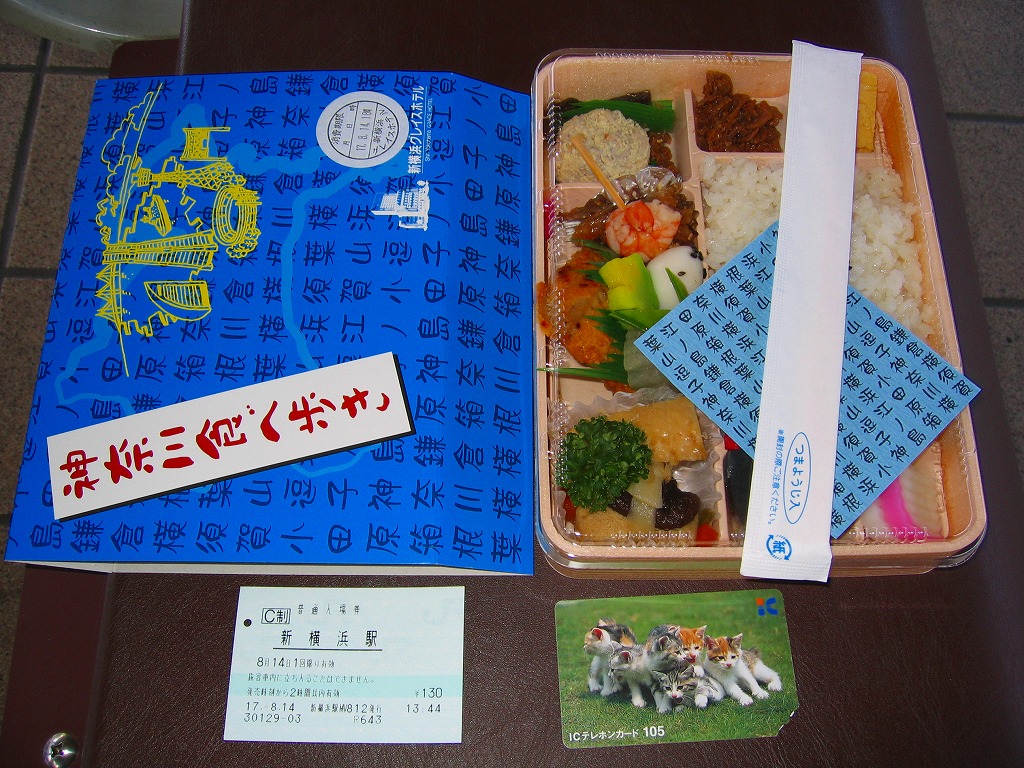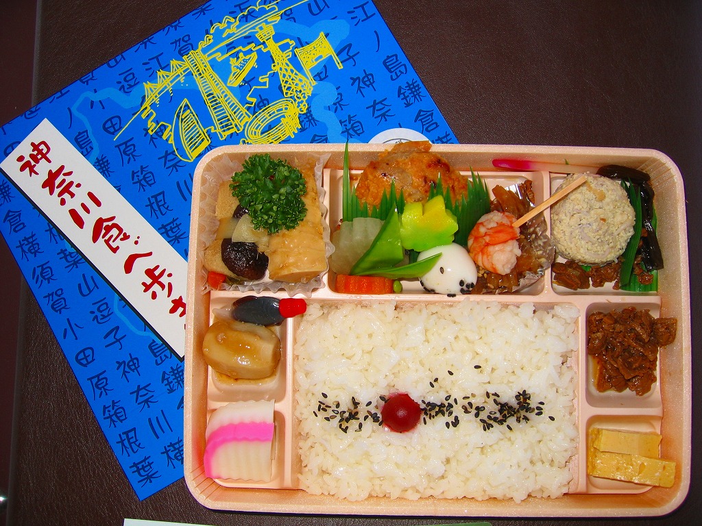 2003(平成15)年11月1日に発売。新横浜の駅前ホテルが調製する、知る人ぞ知る隠れた新横浜駅弁。調製弁当特有の透明山蓋容器を、神奈川県の形や地名に横浜名所を描いた駅弁らしい専用のボール紙の枠にはめる。中身は日の丸御飯に三崎まぐろ味噌焼、葉山牛しぐれ煮、三浦大根のきんぴらや煮物、小田原の蒲鉾などで、神奈川県産がコンセプト。