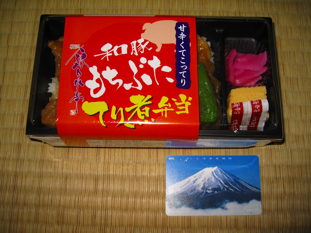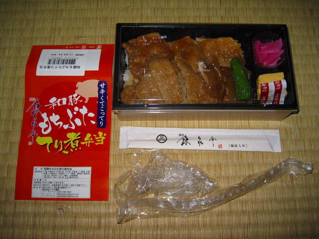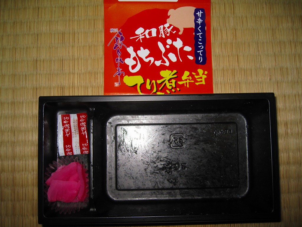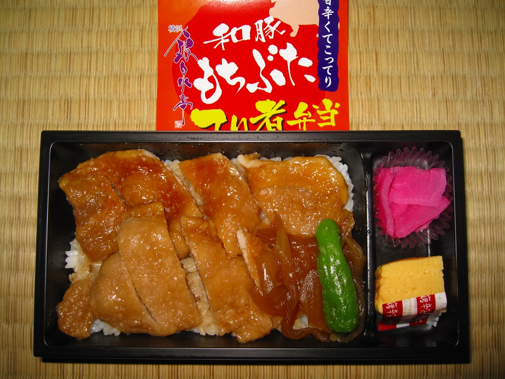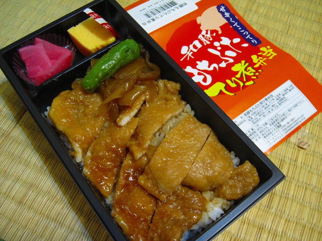 和豚もちぶたとは、仙台駅でも駅弁になったことがある、群馬県渋川市のグローバルピッグファームが持つ銘柄豚で、2011年8月現在で北海道から佐賀県まで81農場で生産されているという。この駅弁の調製元はJRCPではなく、「牛めし」で駅や空港へ乗り込んできたイズミ食品。一時は横浜駅の中や近くでも同社の弁当が買えたが、いつしか売店ごと消滅し、その後にJRCPとの取引ができたようで、このようにJRCPの駅弁売店で買えるようになっていた。201年までの販売か。