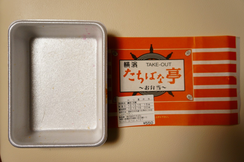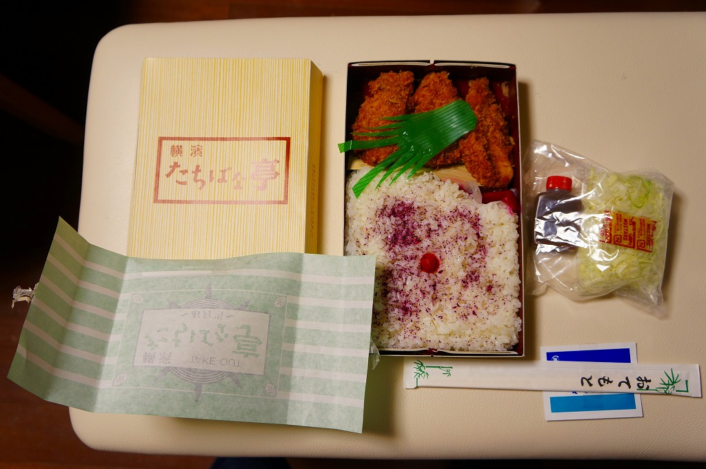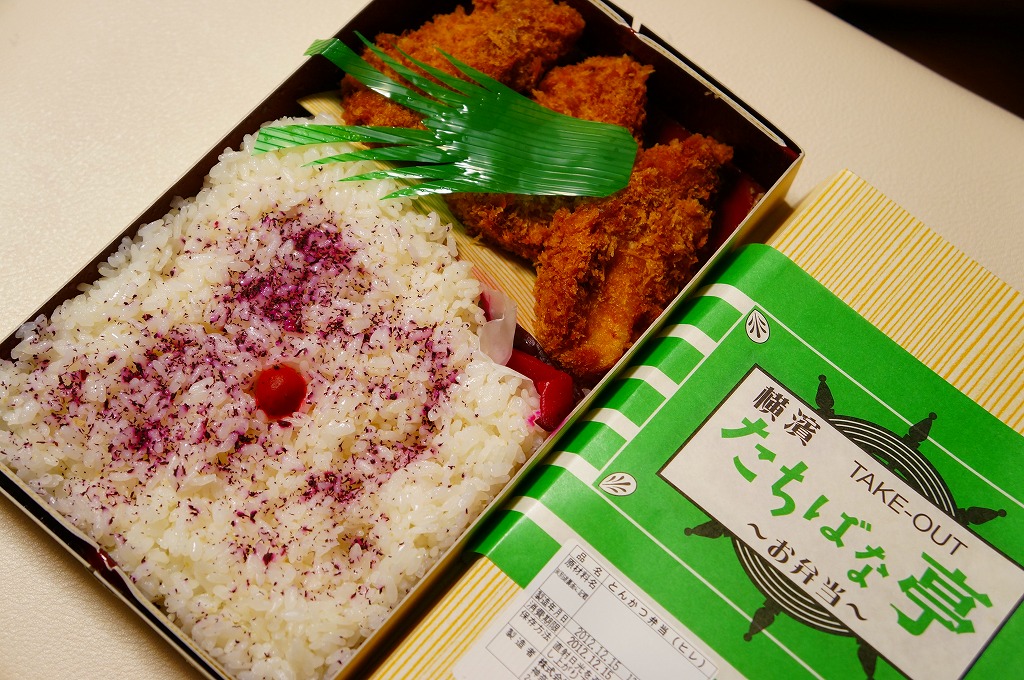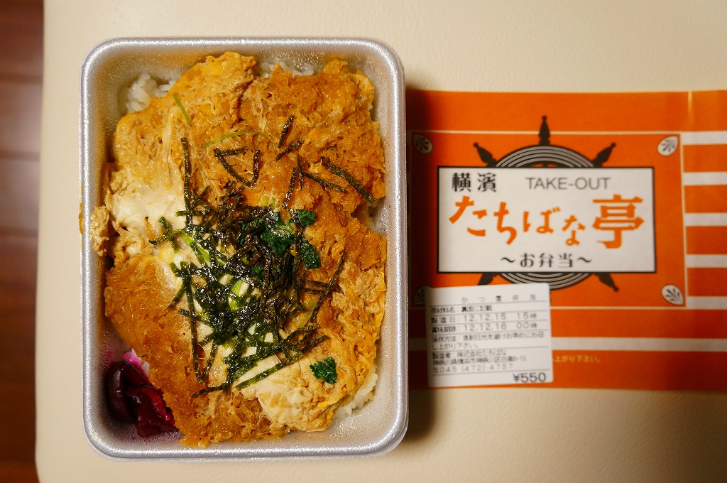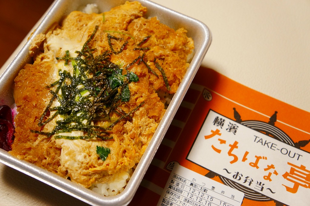 調製元店舗の掛紙を巻いたホカ弁向けな容器に白御飯を敷き、トンカツの卵とじをどーんと載せて、海苔を振って柴漬けを添えたもの。豚肉の脂身の固さと赤身の臭さが昔懐かしい卵とじカツ丼。価格もホカ弁仕様で、実際に同じフロアでこの弁当を売るホカ弁屋があり、この弁当はそこで調製する。「シウマイ弁当」などの横浜駅弁の崎陽軒でもいいけれど、それ以外の駅弁も食べたいな、という地元の新幹線客に、少しずつ支持が広がっていた。2023年に新横浜駅の店舗が閉店したようで、今は駅では買えない。