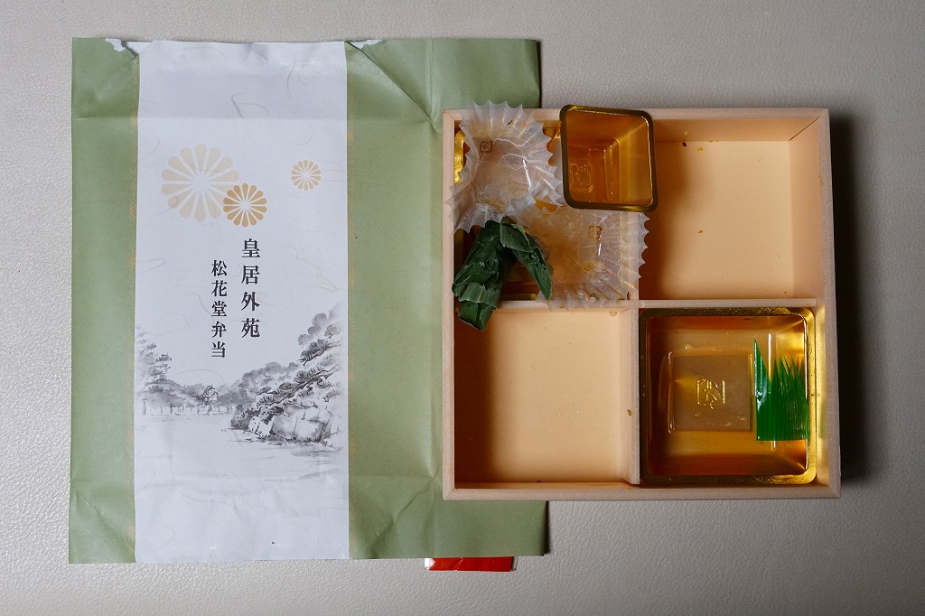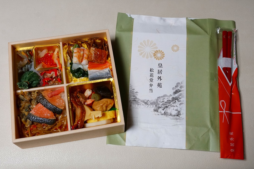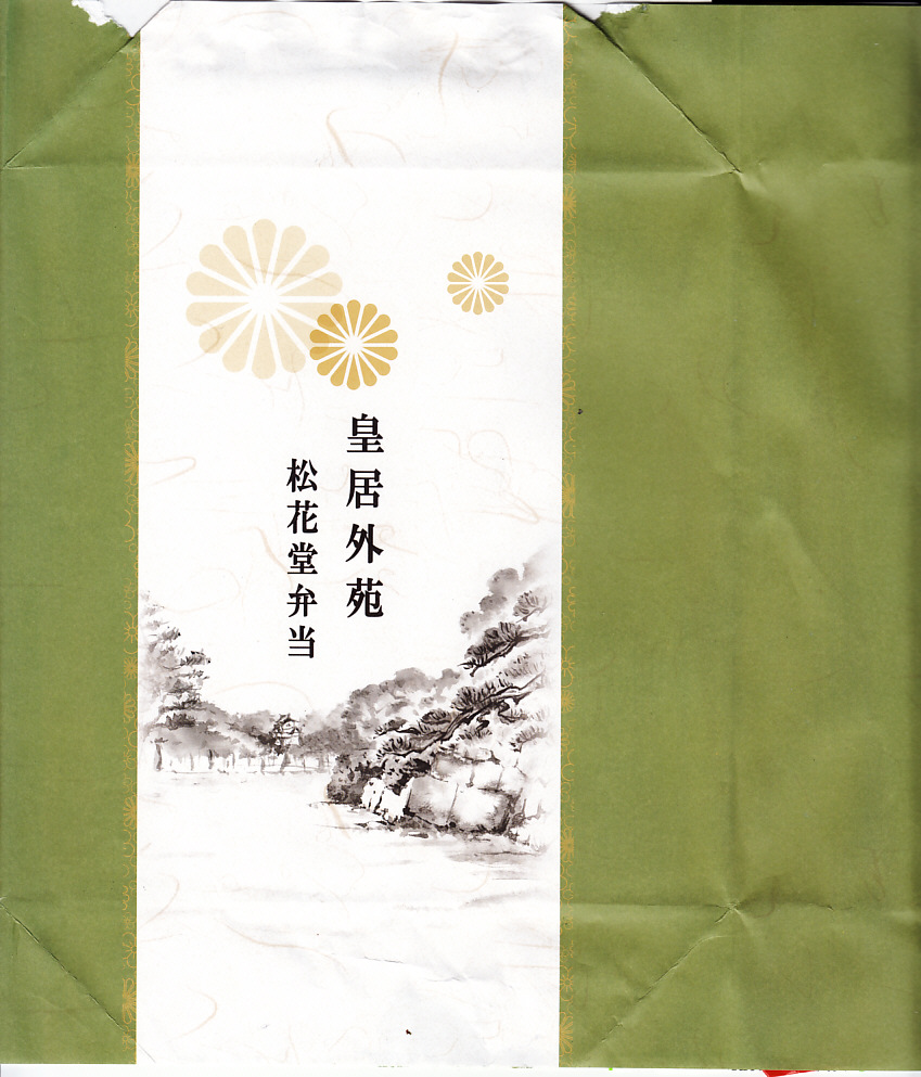 2015(平成27)年から羽田空港で見られるようになった「皇居外苑」ブランドの土産物群の弁当版。新横浜駅で購入したが、東海道新幹線の東京駅や品川駅でも売られているのではないかと思う。松花堂と名乗るので容器の4区画に、ちらしずし、鮭とアサリときんぴらごぼうの御飯、鶏照焼や玉子焼や煮物、イクラ和えや牛肉和えや漬物など。そんなちょっとごちゃごちゃした中身を、羽田空港の土産物と同じく、皇室の菊の御紋に似た菊紋をいくつも描いた包装紙で包んでいた。