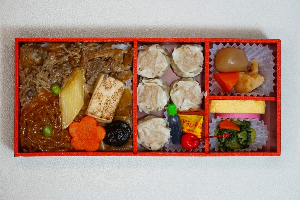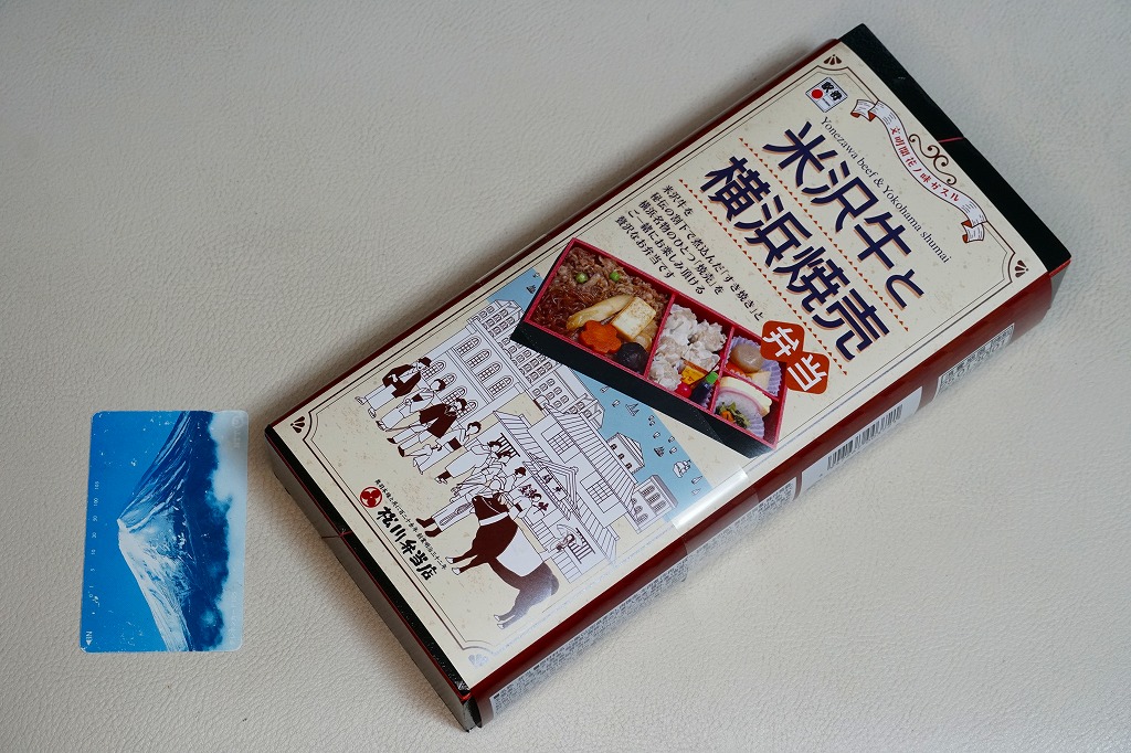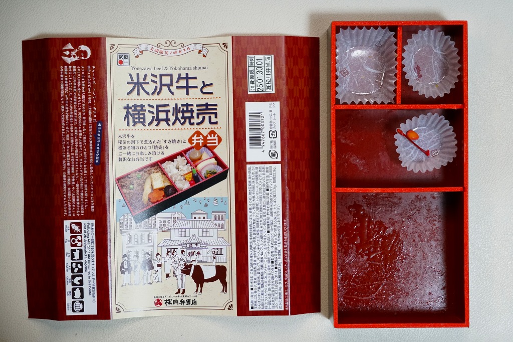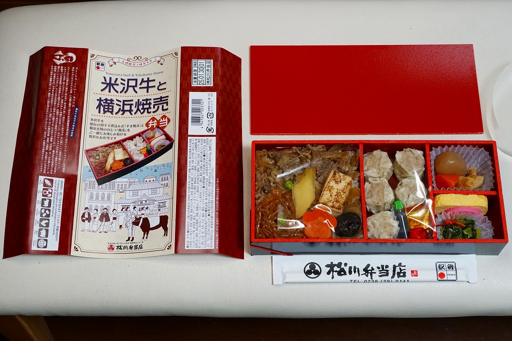 2024(令和6)年12月2日に新横浜駅で発売。調製元は山形県のJR米沢駅の駅弁屋で、販売元は東海道新幹線の各駅で駅弁を販売するJR東海リテイリング・プラスであるが、この弁当は米沢でも東名阪の各地でもなく、新横浜駅に限り売られる。中身は掛紙の写真のとおり、やや細長い容器の、半分弱に白飯を詰めて牛すき焼きで覆い、残る半分に焼売5個と醤油と辛子とさくらんぼ、続いて山形の芋煮を思わせる煮物3点と、青菜の醤油漬と玉子焼とかまぼこ。