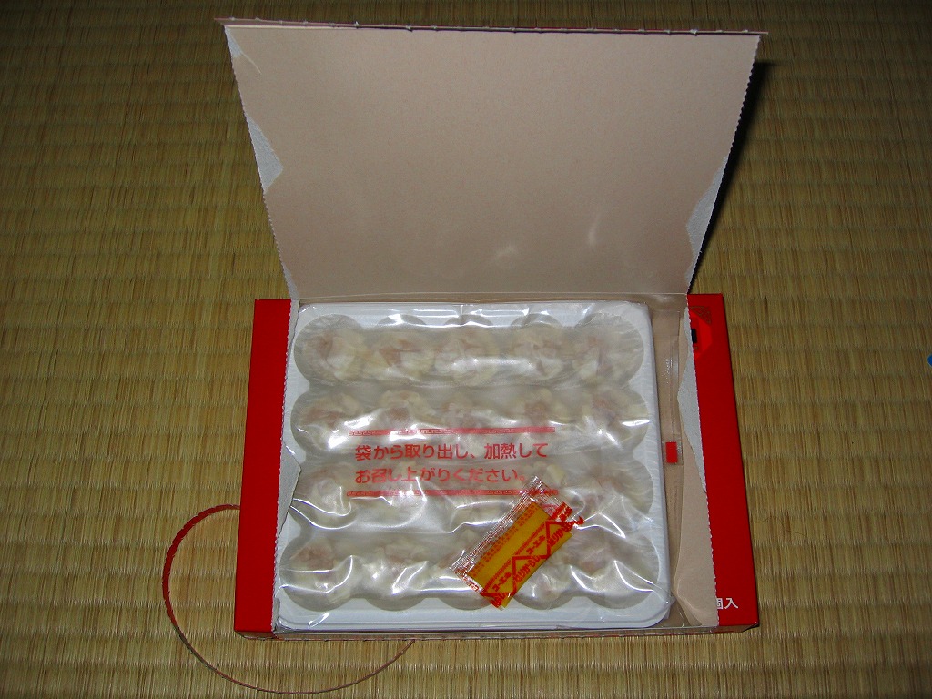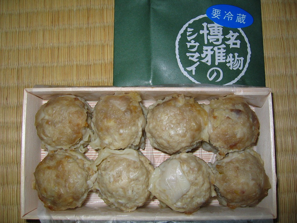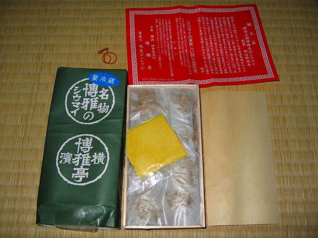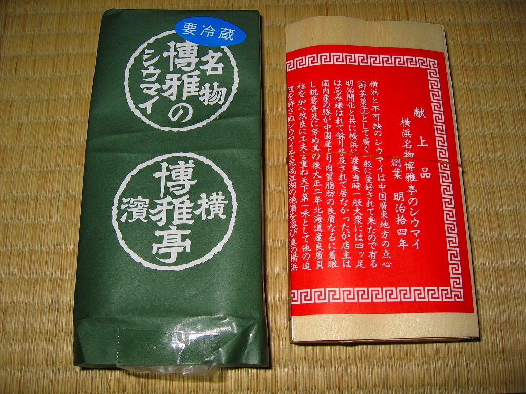 高島屋横浜店で見つけた、横浜名物シウマイの崎陽軒でないパッケージ。赤い紙箱の中に12個の焼売が入って525円は崎陽軒より単価が高いが、サイズは心持ち大きめで、味はまったく異なり豚肉の風味が支配的な肉焼売。富山のますのすしと同様、横浜のシウマイも様々な業者が製品を出しているので、これから集めていきたい。