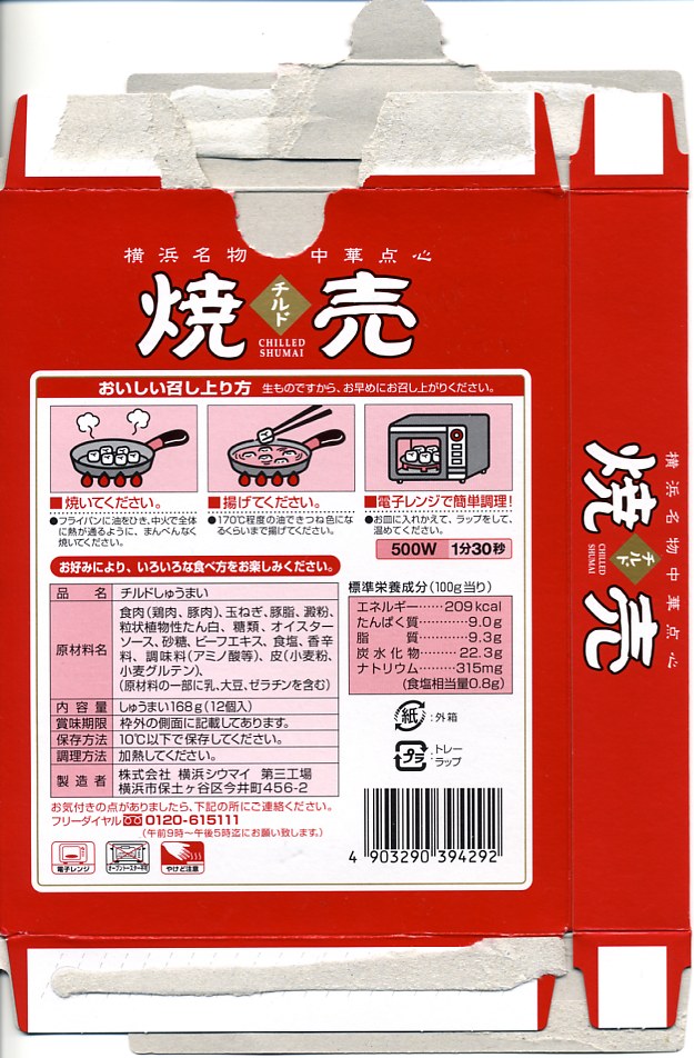 特徴なき日常食。ただ、パッケージの「横浜名物中華点心」「伝統のおいしさ」あたりの記述が引っかかる。まさかこの店にこの値段で土産物を買いに来る人はいないと思うが、横浜名物の焼売がこの程度のものだと認識されるのは、崎陽軒その他の地元の焼売屋にとって不本意だろう。