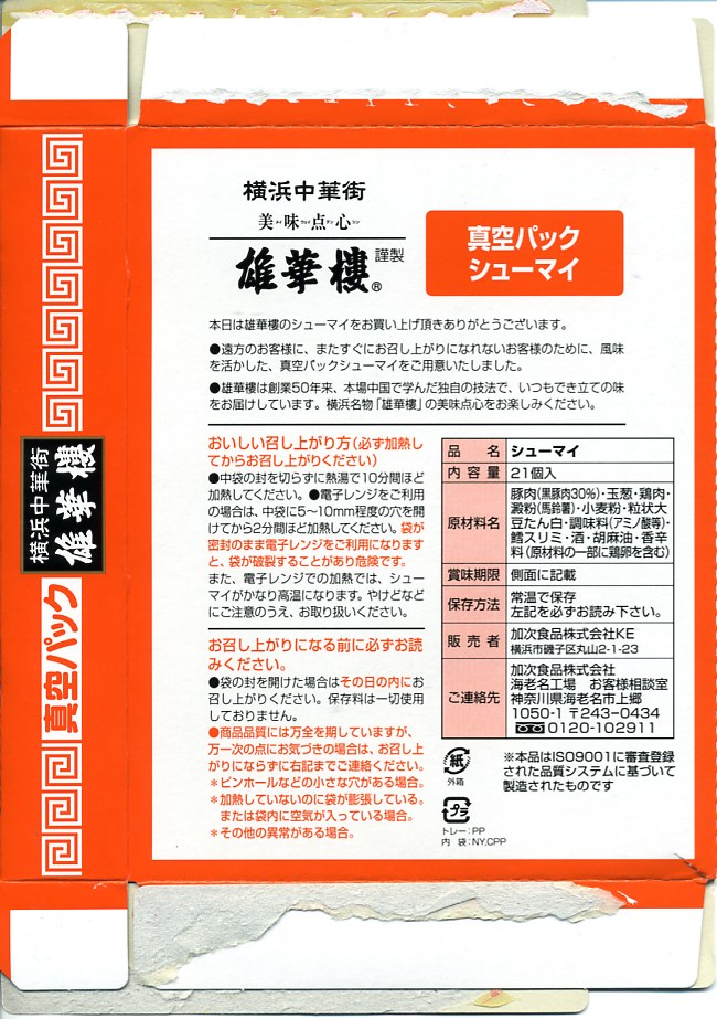 高速道路のサービスエリアや一部空港で手広く販売されている雄華樓ブランドの焼売のうち、通常版焼売単品の真空パック商品。写真のとおり、皮が見た目で一体化してしまった焼売が21個、透明な袋で真空パックになって、赤い紙箱に収められる。風味は駅弁で有名な崎陽軒とは違い、豚肉の味が勝る印象。3か月間保存可能。