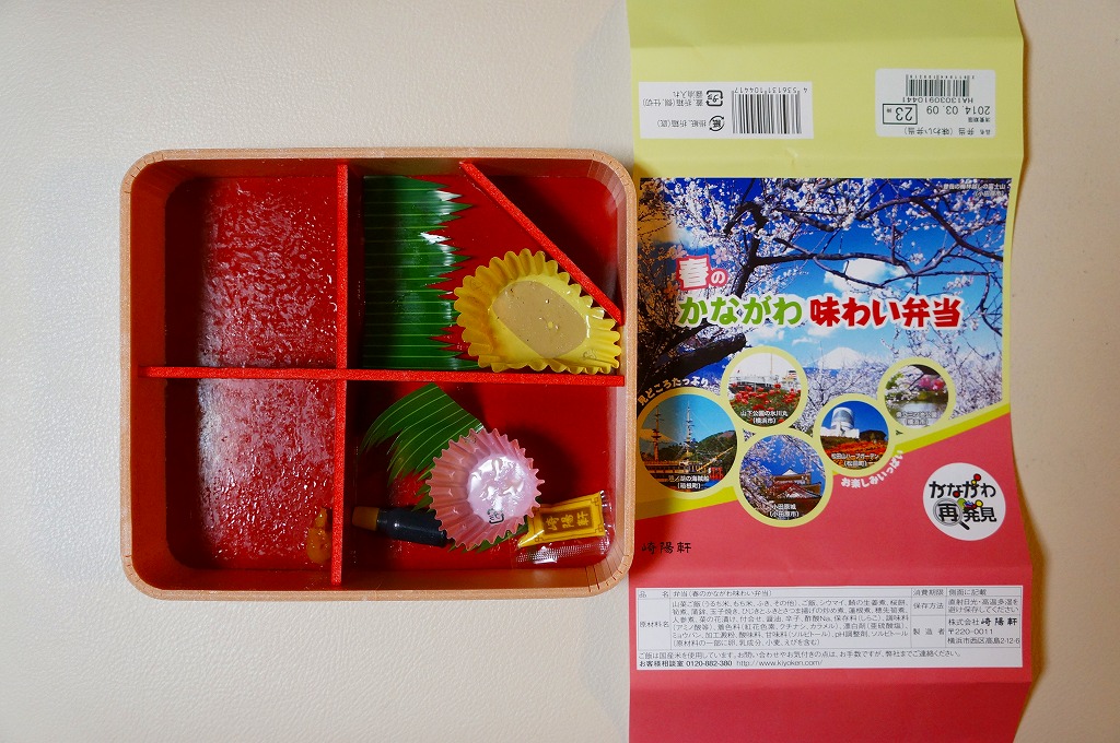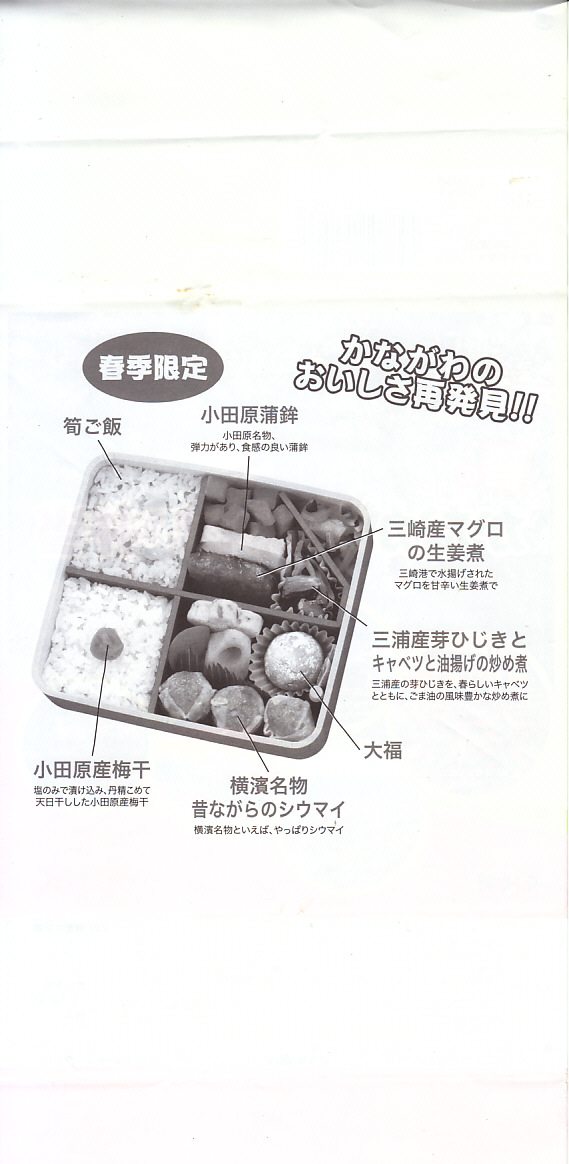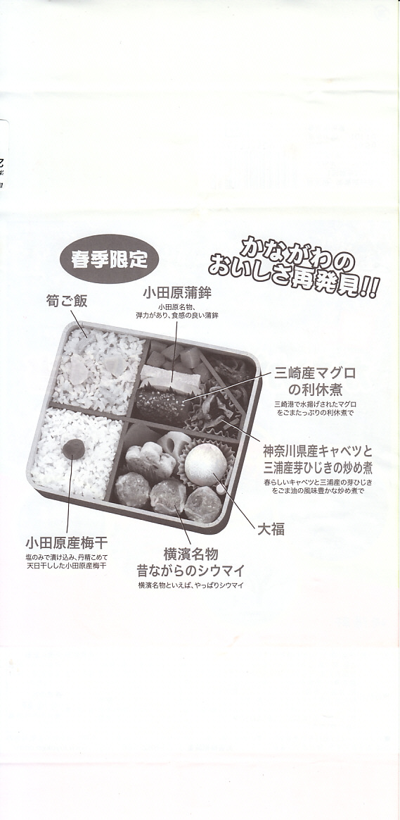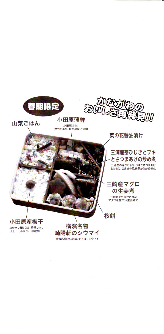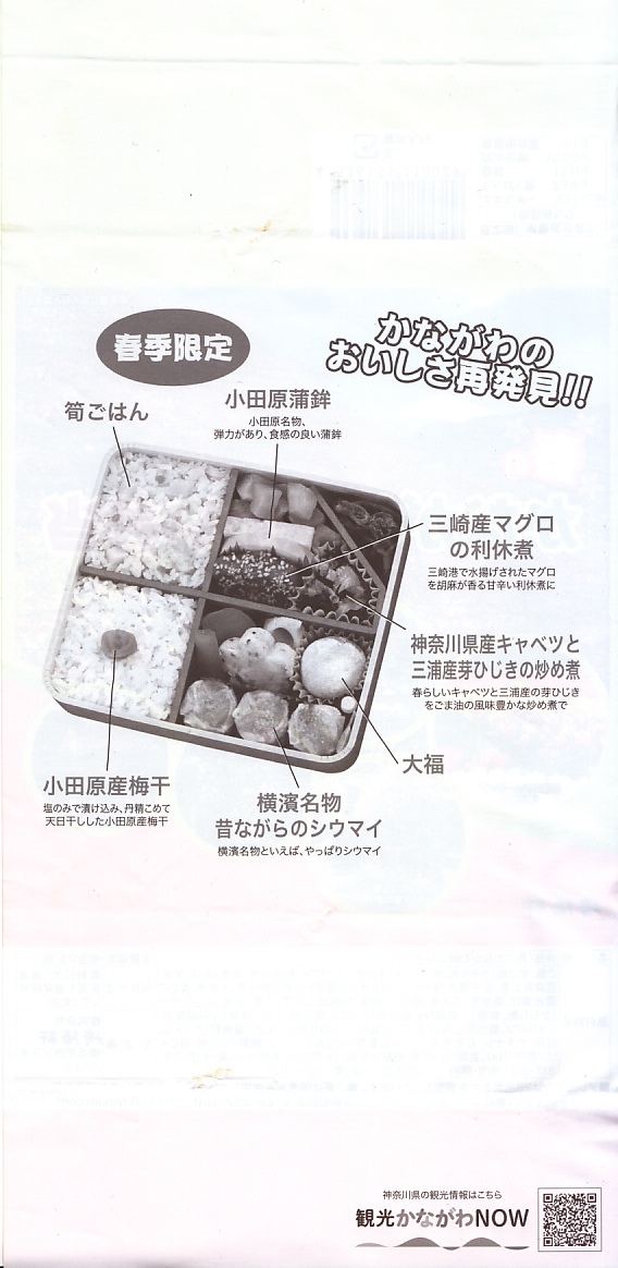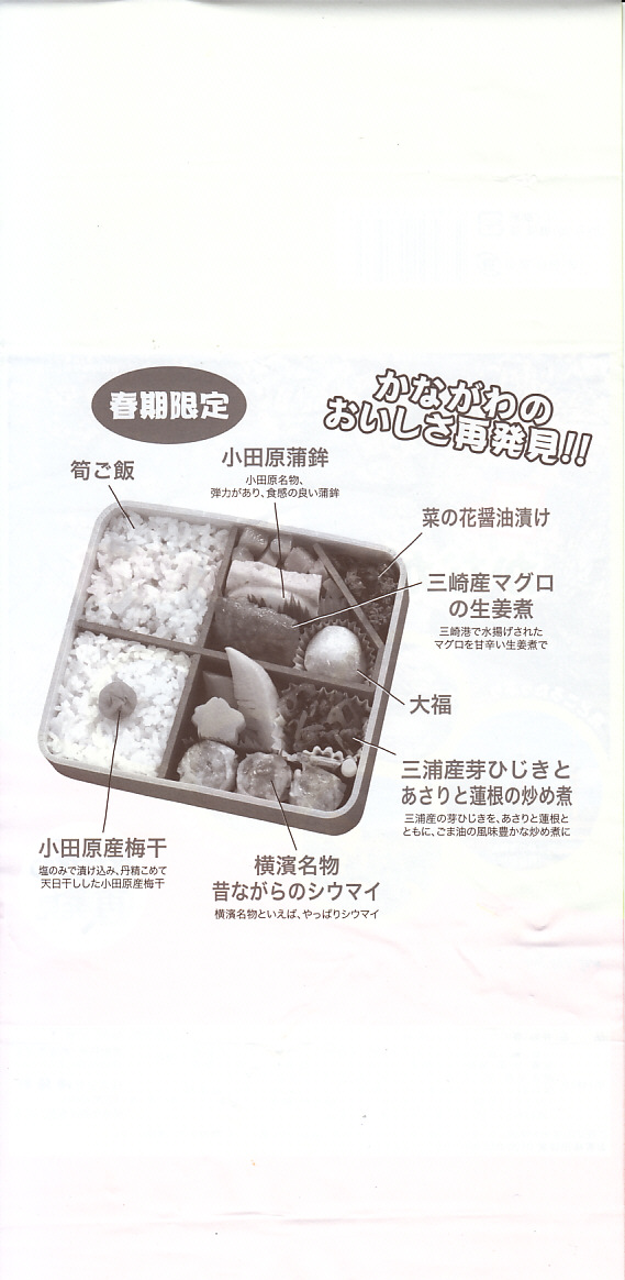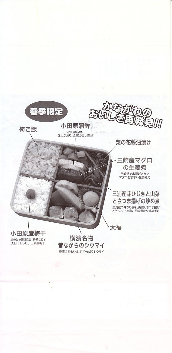2014(平成26)年3月1日から31日までの販売。秋や冬ではなく春に初めて出てきた、かながわ味わい弁当。容器と価格と掛紙の意匠は昨秋と変わらず、しかし掛紙の写真は花が咲く春のものに差し替えられ、中身の一部にも春を感じる食材が使われる。山菜御飯と小田原産梅干の日の丸御飯、三崎産マグロ生姜煮、三浦産芽ひじきとフキとさつま揚げの炒め煮、小田原かまぼこ、玉子焼、タケノコやレンコンなどの煮物、菜の花の醤油漬、桜餅、シウマイ3個。
