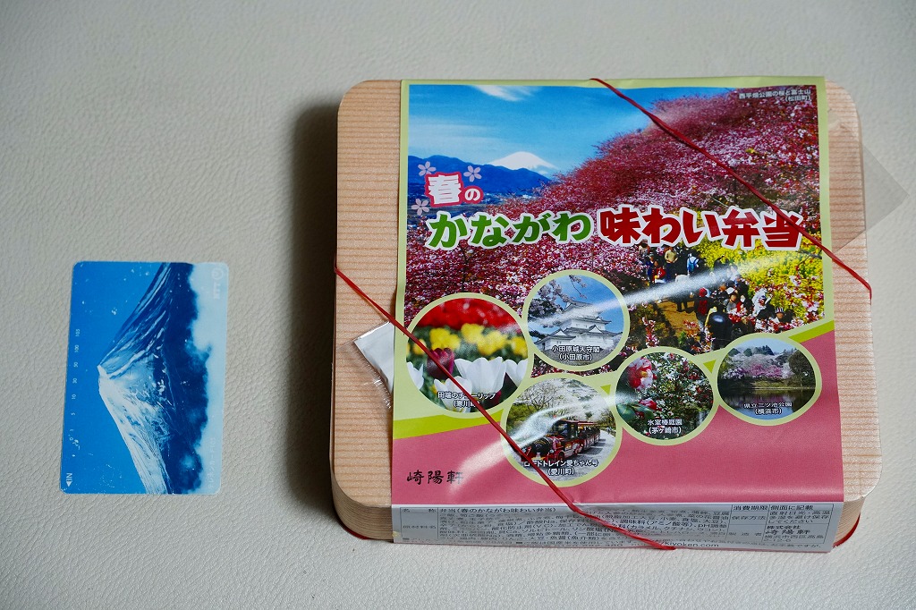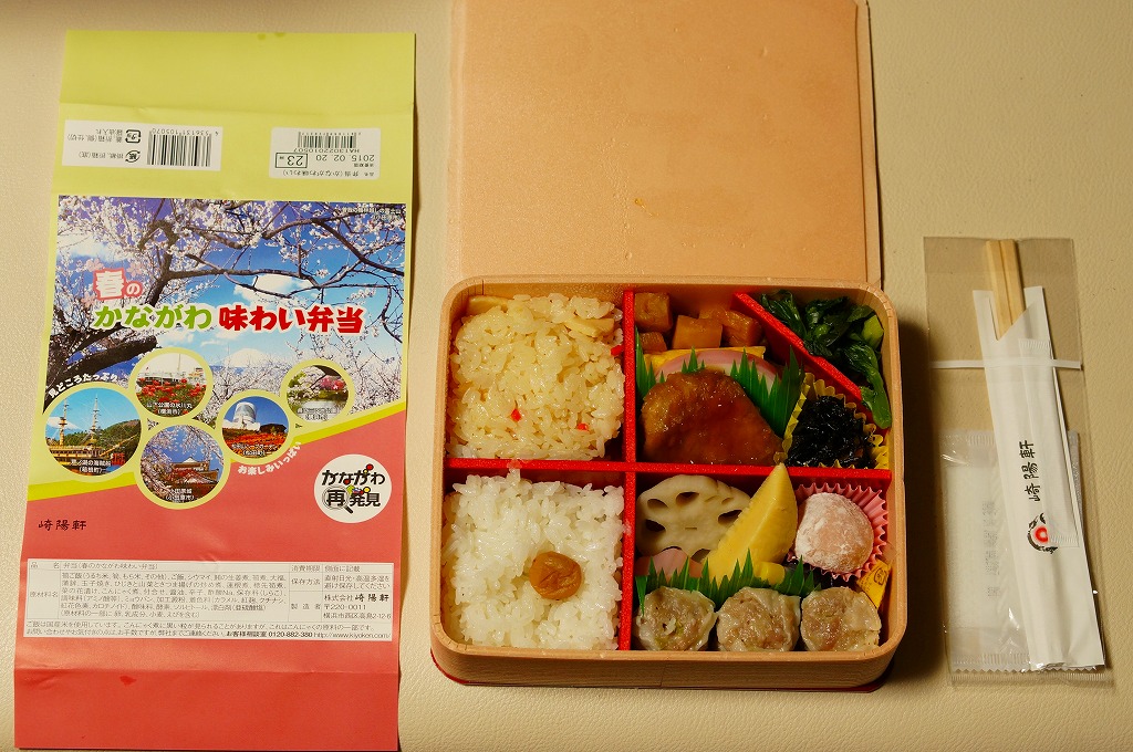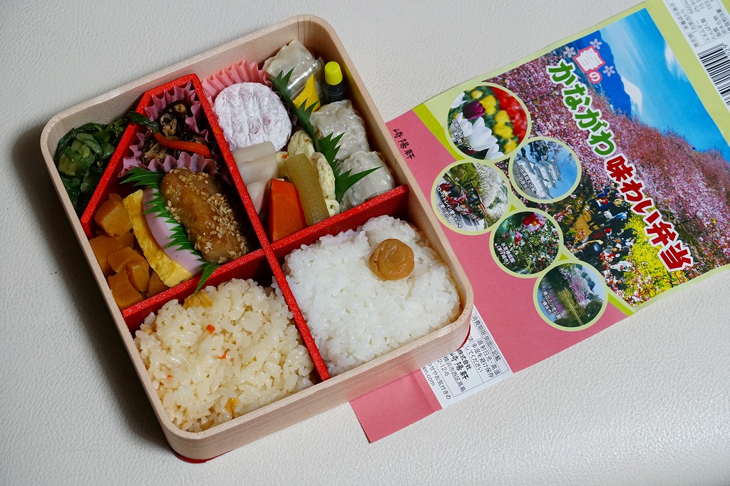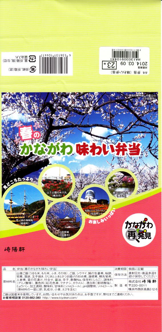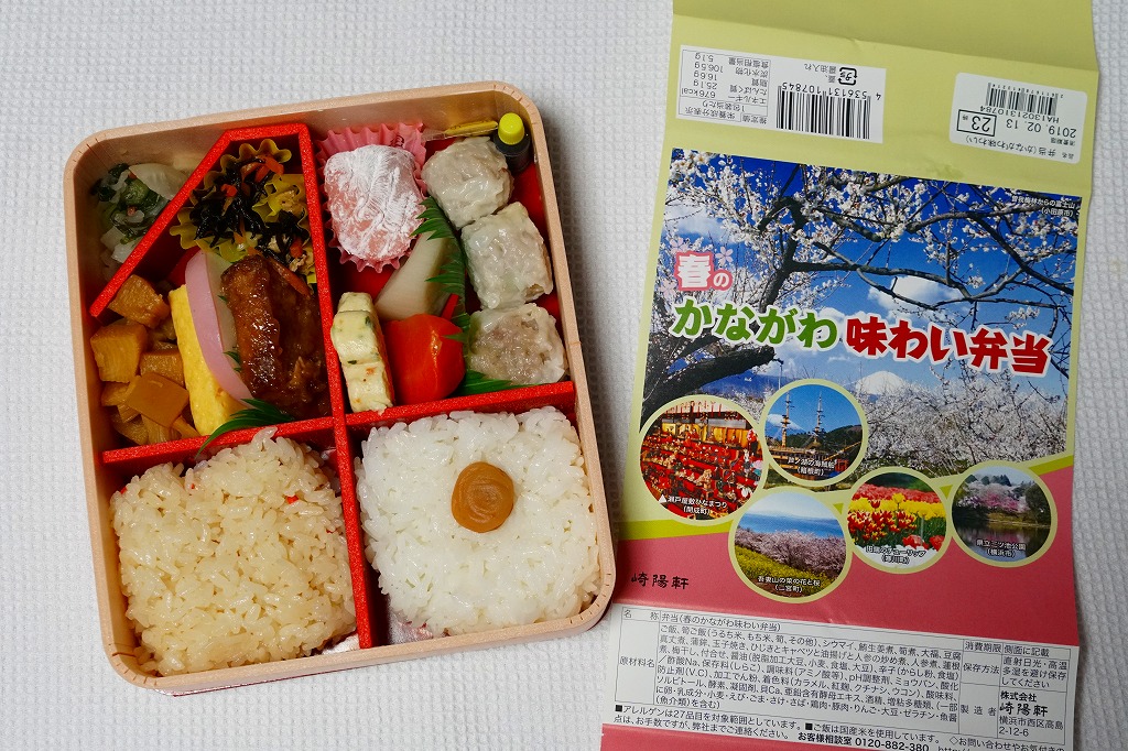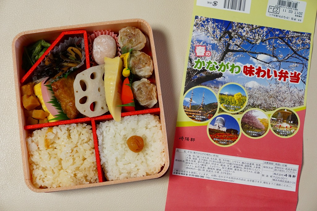 2014(平成26)年3月1日から31日までの販売。秋や冬ではなく春に初めて出てきた、かながわ味わい弁当。容器と価格と掛紙の意匠は昨秋と変わらず、しかし掛紙の写真は花が咲く春のものに差し替えられ、中身の一部にも春を感じる食材が使われる。山菜御飯と小田原産梅干の日の丸御飯、三崎産マグロ生姜煮、三浦産芽ひじきとフキとさつま揚げの炒め煮、小田原かまぼこ、玉子焼、タケノコやレンコンなどの煮物、菜の花の醤油漬、桜餅、シウマイ3個。