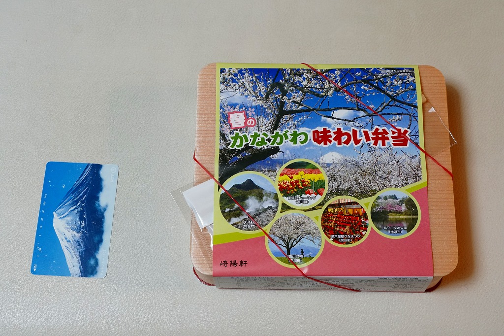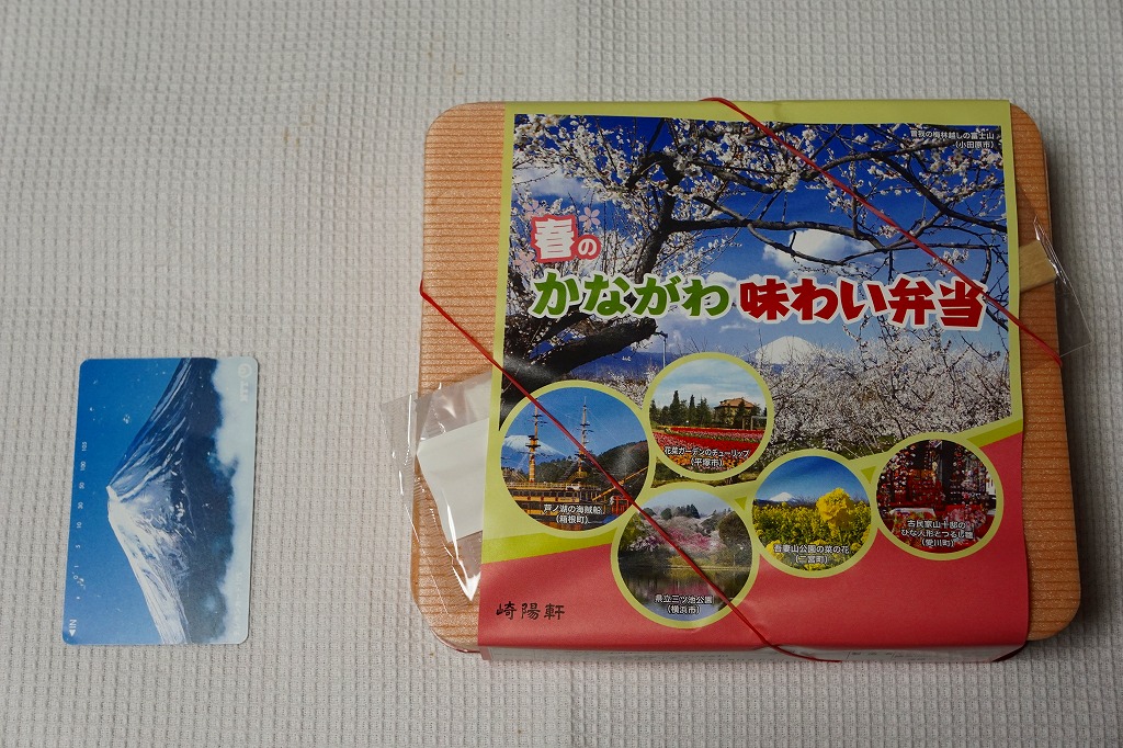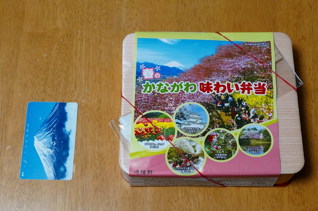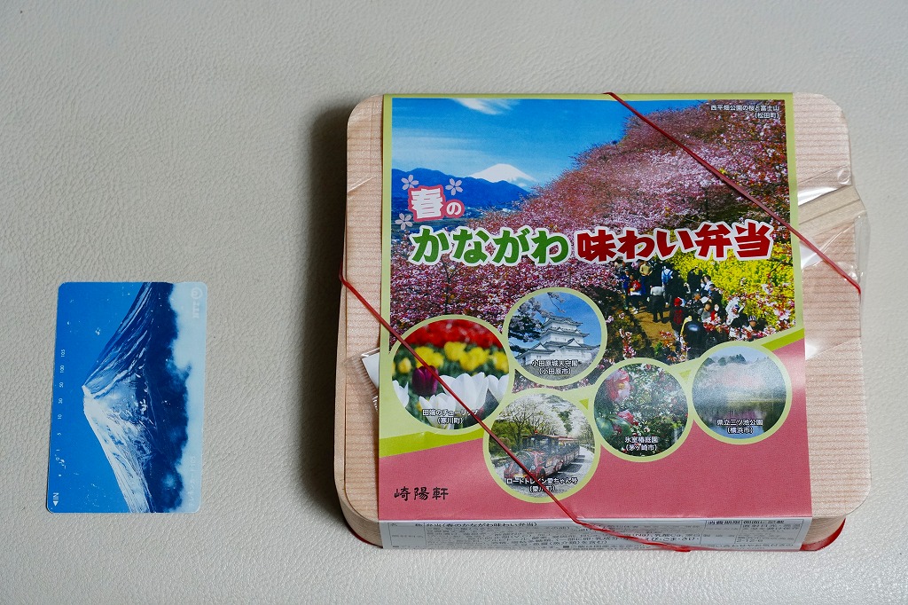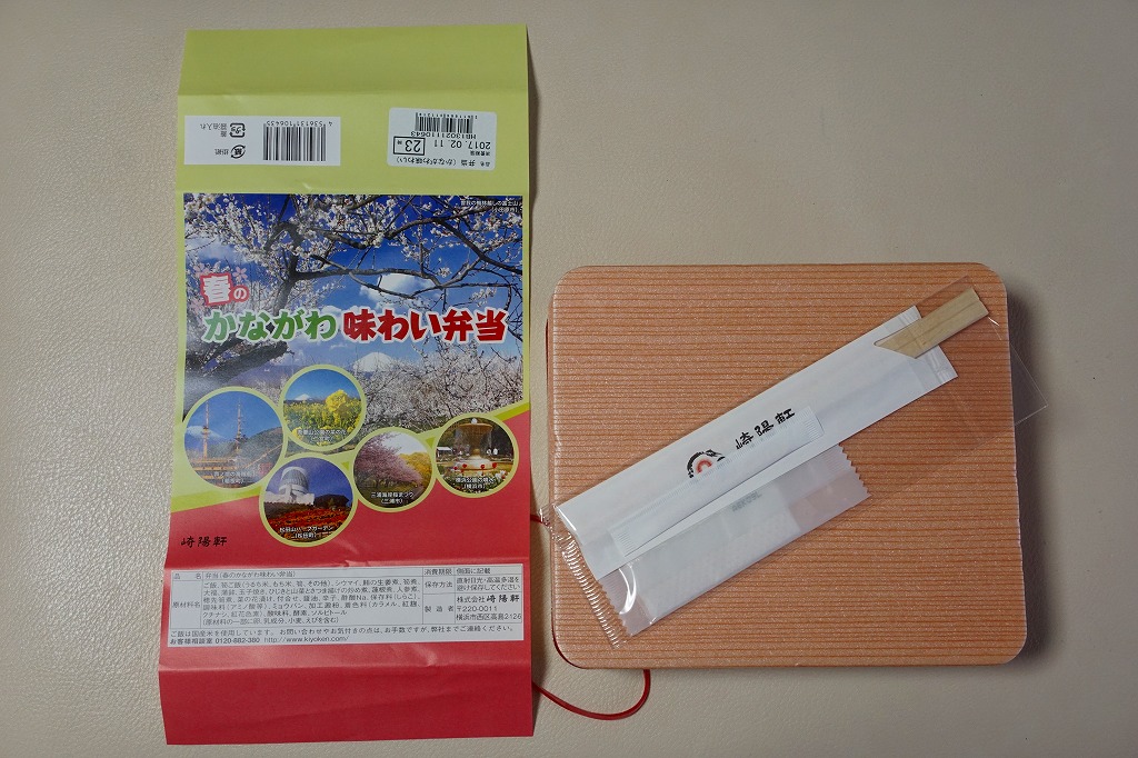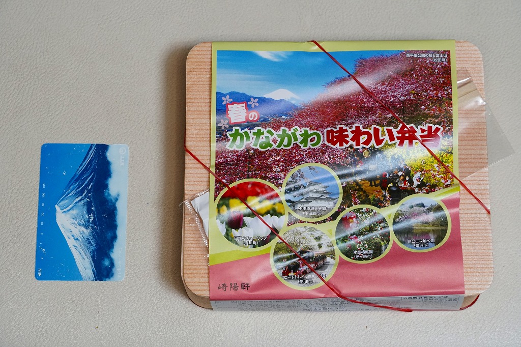 2014(平成26)年3月1日から31日までの販売。秋や冬ではなく春に初めて出てきた、かながわ味わい弁当。容器と価格と掛紙の意匠は昨秋と変わらず、しかし掛紙の写真は花が咲く春のものに差し替えられ、中身の一部にも春を感じる食材が使われる。山菜御飯と小田原産梅干の日の丸御飯、三崎産マグロ生姜煮、三浦産芽ひじきとフキとさつま揚げの炒め煮、小田原かまぼこ、玉子焼、タケノコやレンコンなどの煮物、菜の花の醤油漬、桜餅、シウマイ3個。