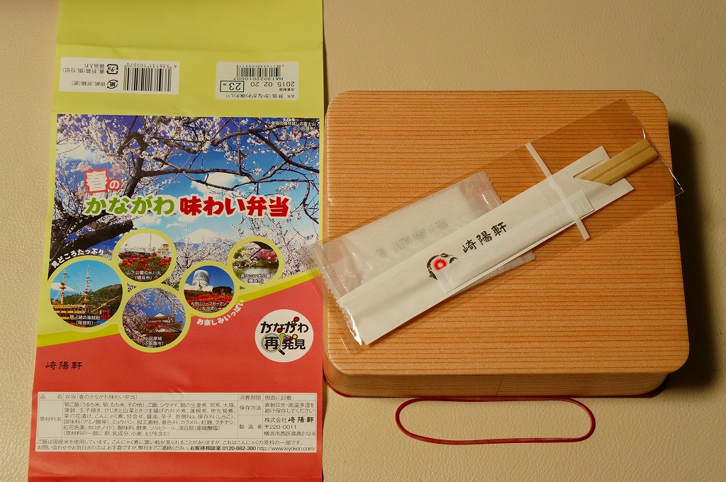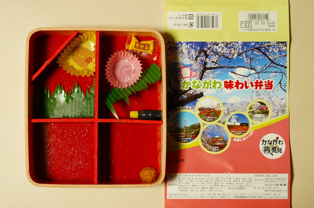 横浜駅弁「かながわ味わい弁当」の2015(平成27)年の春バージョンで、今回は2月15日から4月15日まで前年の倍の2か月間の販売。掛紙と容器は前年と同じ。中身は少し変わり、タケノコ御飯と小田原産梅干の日の丸御飯、三崎産マグロ生姜煮、三浦産芽ひじきと山菜とさつま揚げの炒め煮、小田原かまぼこ、玉子焼、タケノコやレンコンなどの煮物、菜の花の醤油漬、大福、シウマイ3個。価格は「秋」と同じく、前年から50円のアップ。