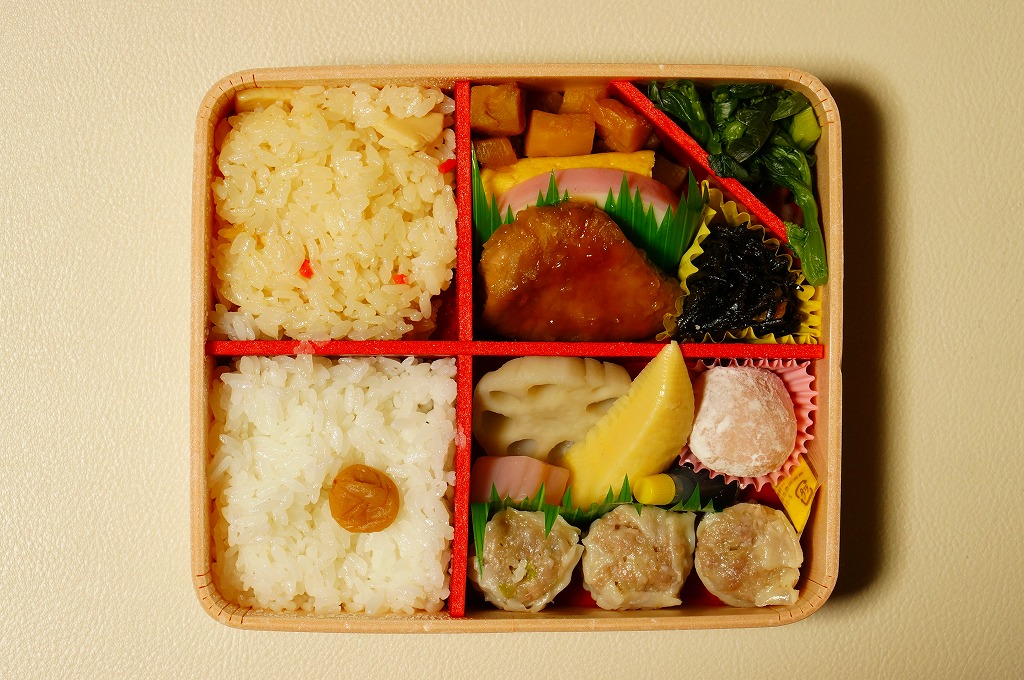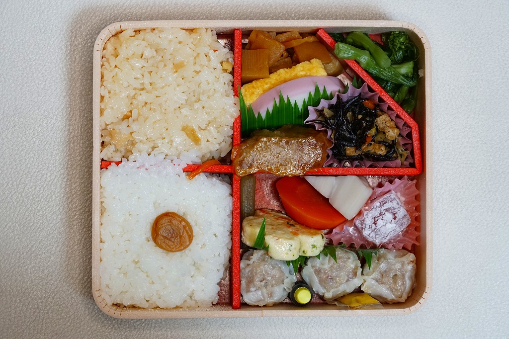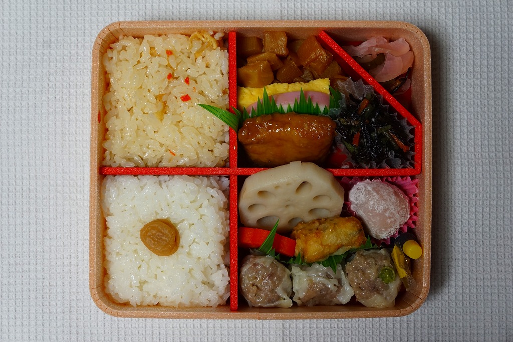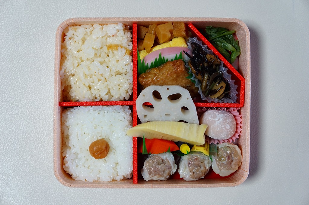 中身は前年とほぼ同じで、タケノコ御飯と日の丸御飯、マグロ利久煮、芽ひじきとキャベツと油揚げの炒め煮、かまぼこ、タケノコ煮、ニンジンやレンコンなどの煮物、花形豆腐煮、玉子焼、菜の花の醤油漬け、大福(つぶあん)、シウマイ3個。