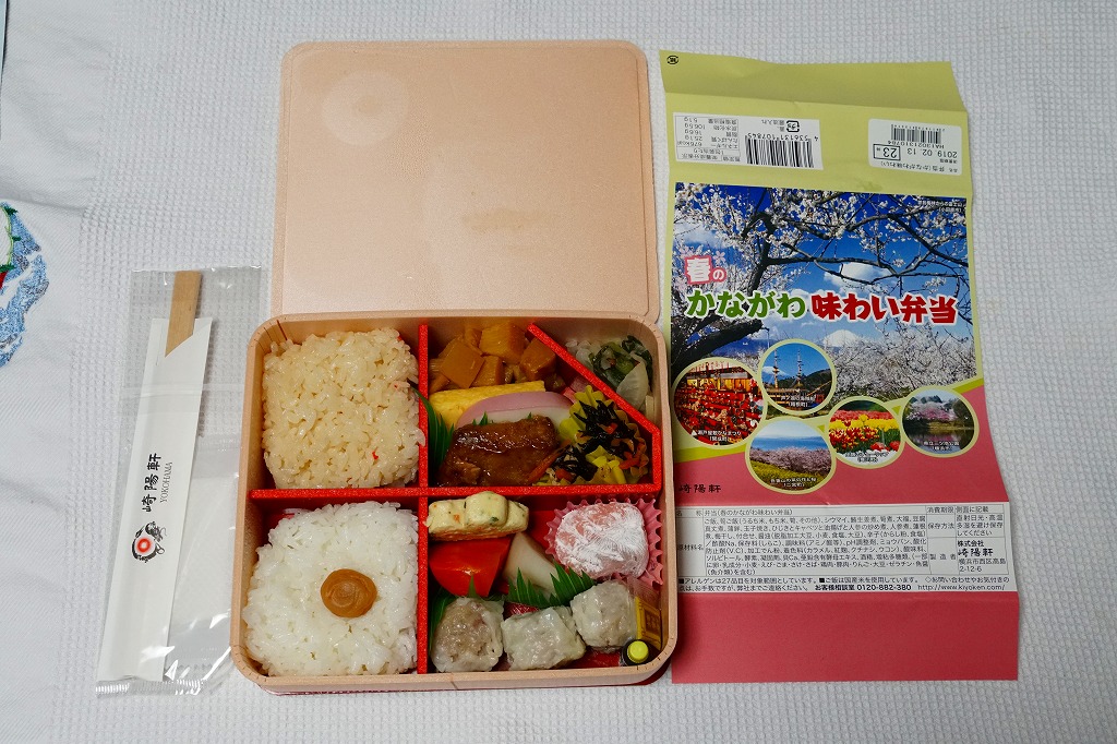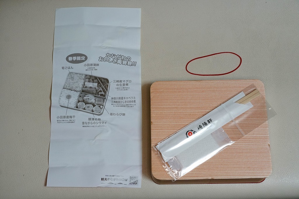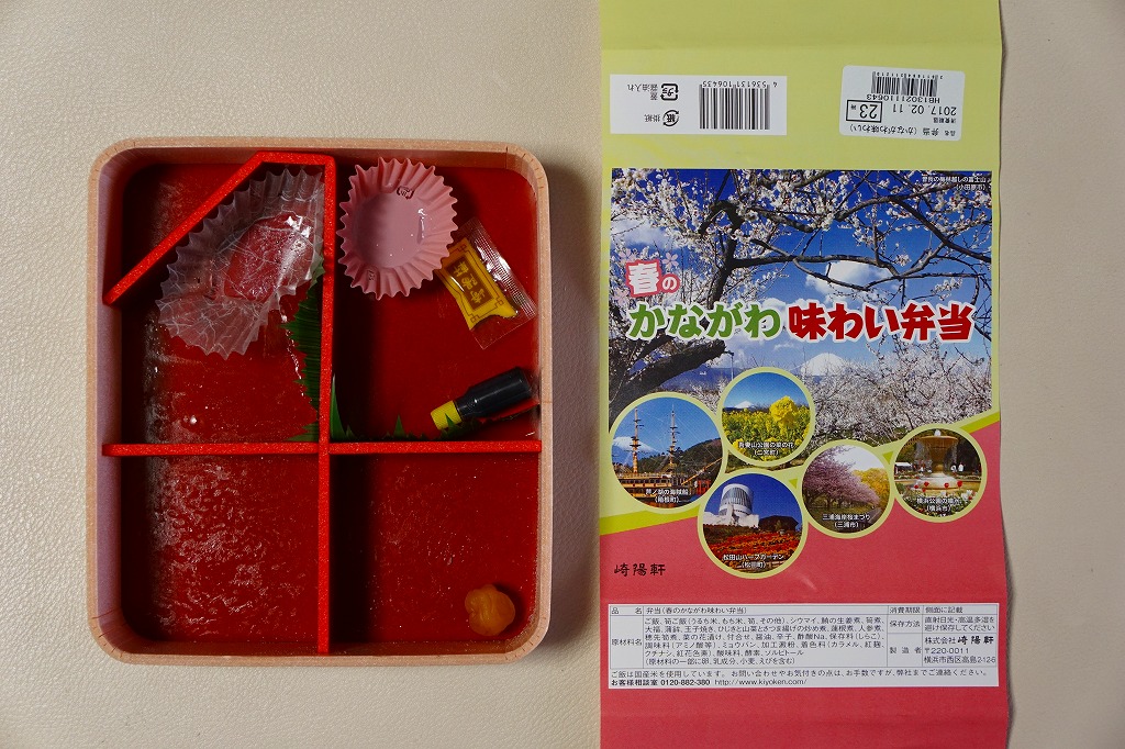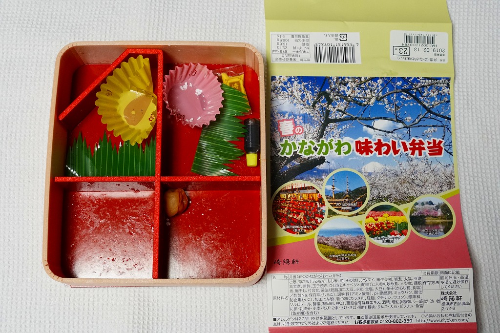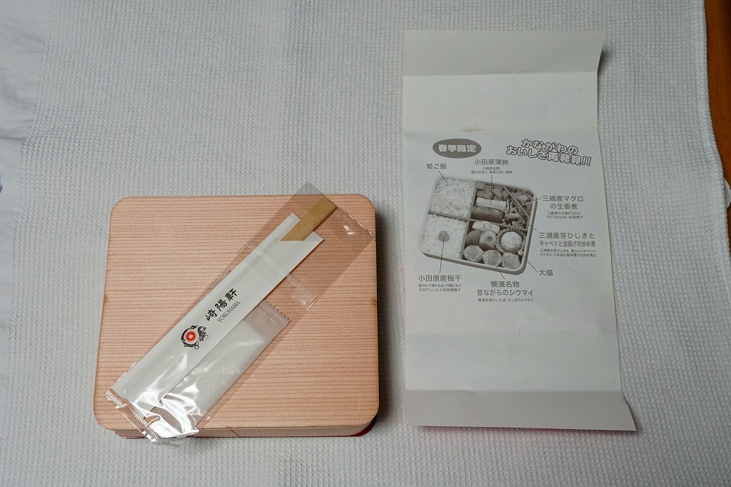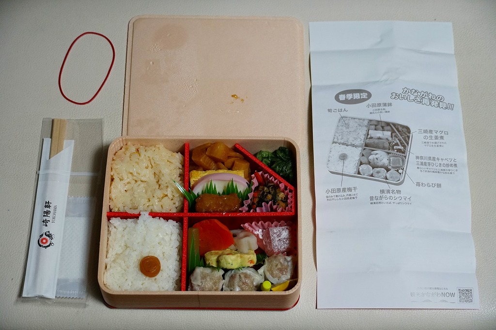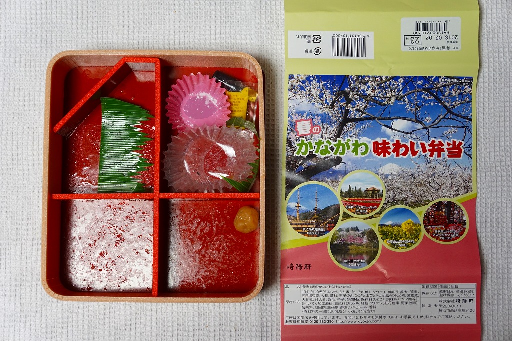 中身は前年と同じで、タケノコ御飯と日の丸御飯、マグロ利久煮、芽ひじきとキャベツと油揚げの炒め煮、かまぼこ、タケノコ煮、ニンジンやレンコンなどの煮物、花形豆腐煮、玉子焼、菜の花の醤油漬け、大福(つぶあん)、シウマイ3個。掛紙の裏面に写真付きで記したお品書きでの、小田原蒲鉾のプロフィール「弾力があり、食感の良い蒲鉾」が、この年は「歯応えの良い蒲鉾」に変わった。