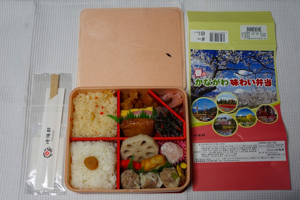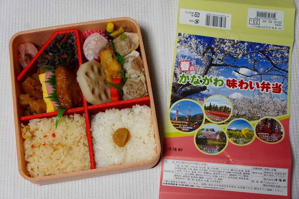 横浜駅弁「かながわ味わい弁当」で5シーズン目の「春」版で、2018(平成30)年2月1日から4月15日までの販売で、やはり神奈川県とのタイアップ企画。掛紙の写真に「花菜ガーデンのチューリップ(平塚市)」「県立三ツ池公園(横浜市)」「古民家山十邸のひな人形とつるし雛(愛川町)」が加わった。中身は前年から、煮物のタケノコを揚げ豆腐に、菜の花醤油漬を大根桜漬に変えただけ。もう何も変える必要がないのだろう。