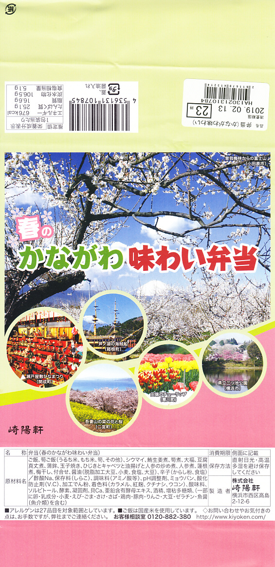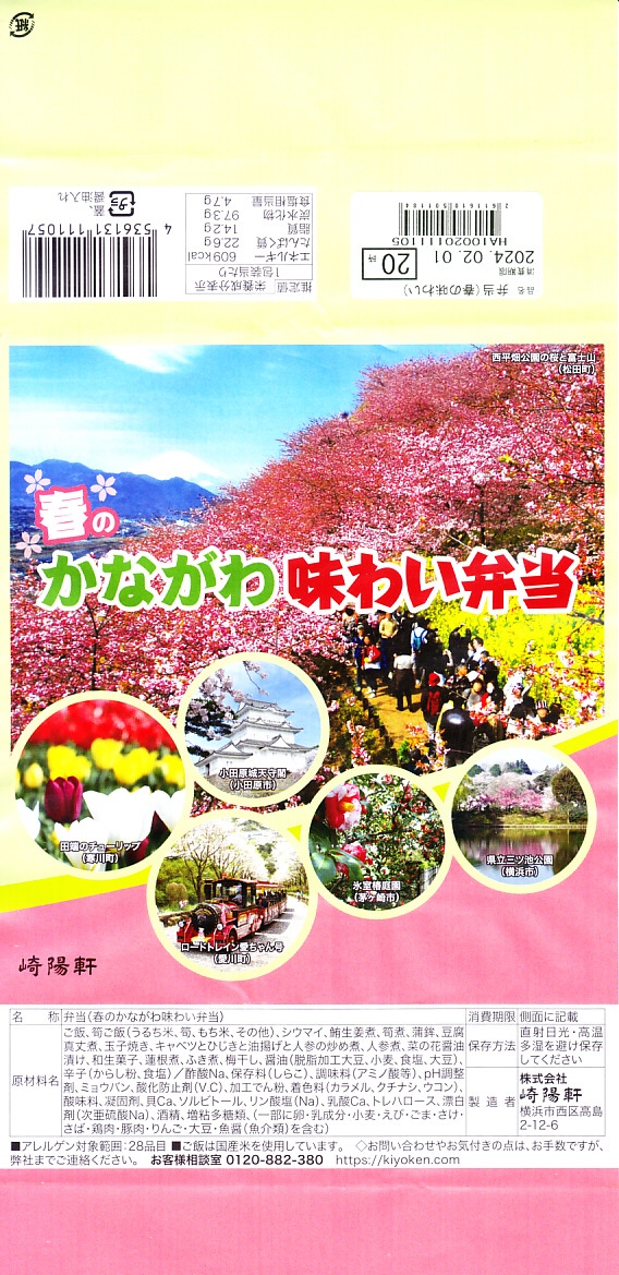 横浜駅弁「かながわ味わい弁当」で7シーズン目の「春」版で、2020(令和2)年2月1日から4月15日までの販売で、やはり神奈川県とのタイアップ企画。掛紙の写真に「大涌谷(箱根町)」「渋田川の桜(平塚市)」「瀬戸屋敷ひなまつり(開成町)」が加わった。