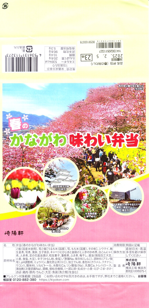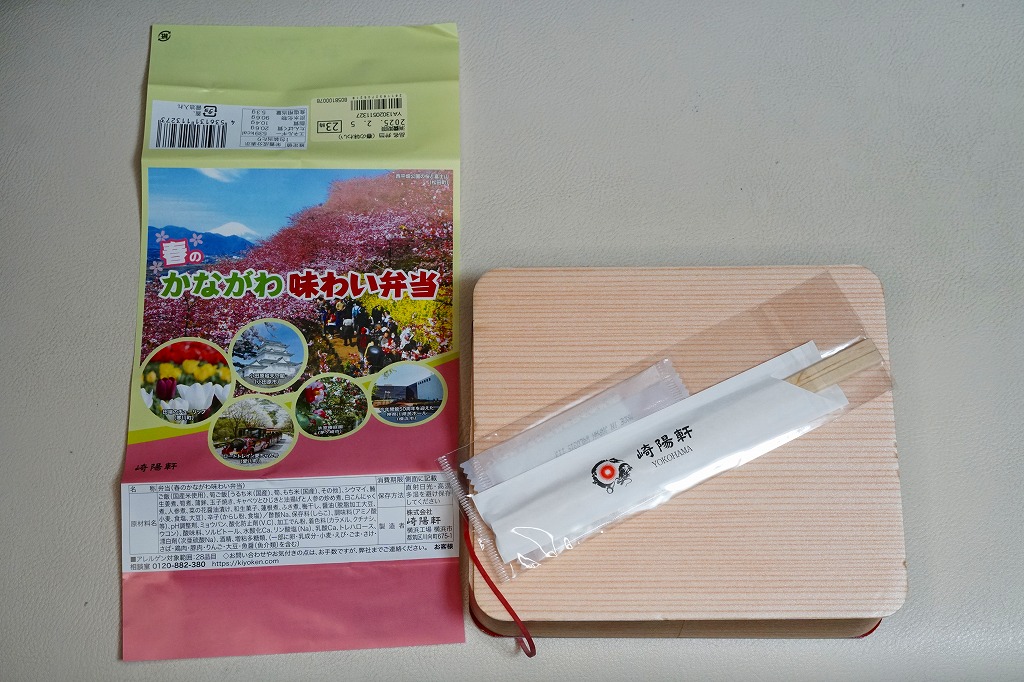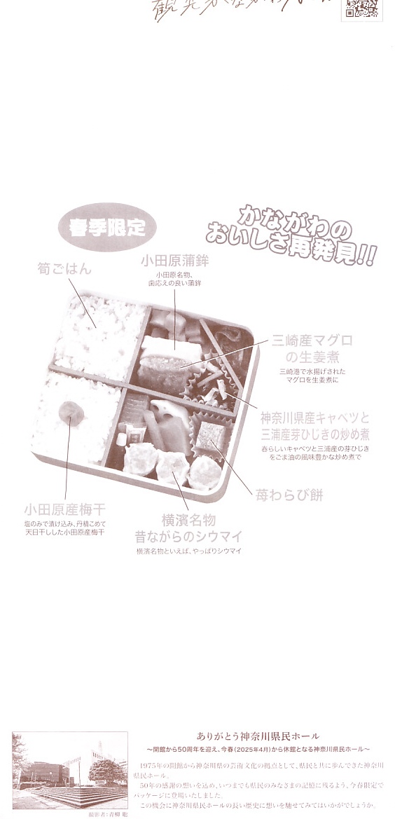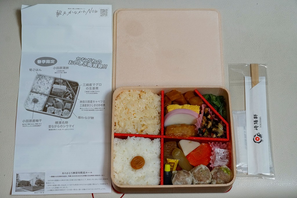 横浜駅弁「かながわ味わい弁当」で12シーズン目の「春」版で、2025(令和7)年2月1日から4月15日までの販売で、やはり神奈川県とのタイアップ企画。掛紙の写真には「今年開館50周年を迎えた神奈川県民ホール(横浜市)」が加わったが、販売期間中の3月限りで閉館している。価格は90円アップの1,180円。