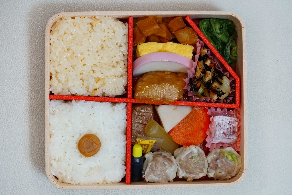 中身は前年とほぼ同じで、タケノコ御飯と日の丸御飯、マグロ利久煮、芽ひじきとキャベツと油揚げの炒め煮、かまぼこ、タケノコ煮、ニンジンやレンコンの煮物、花形豆腐煮、玉子焼、菜の花の醤油漬け、大福(つぶ餡)、シウマイ3個。