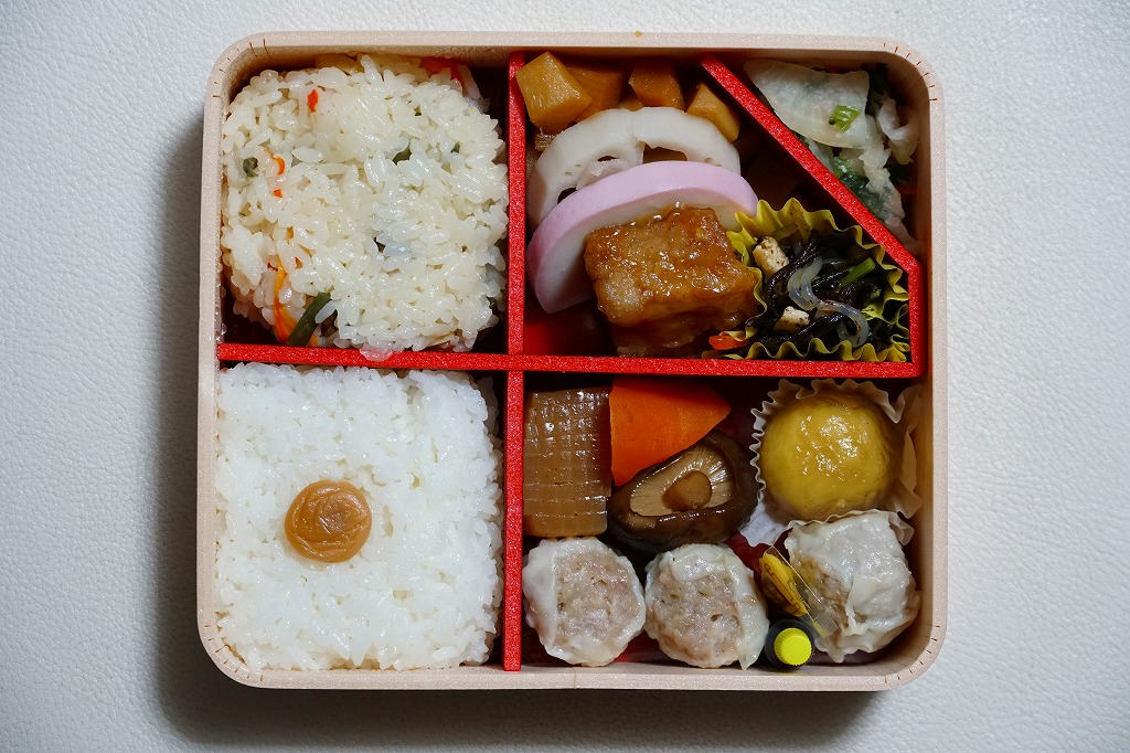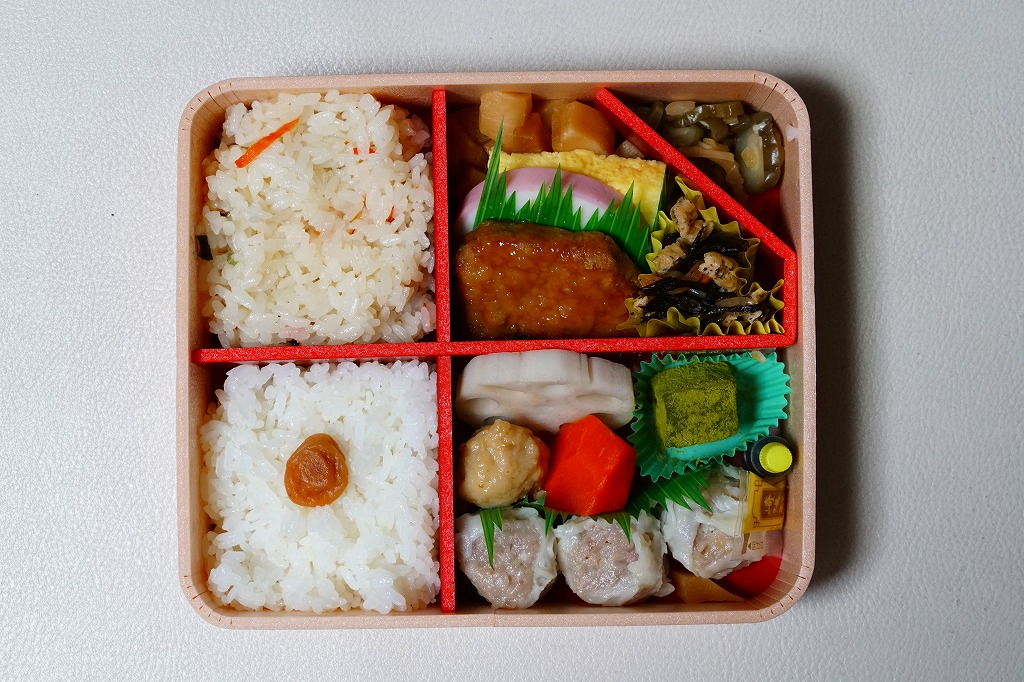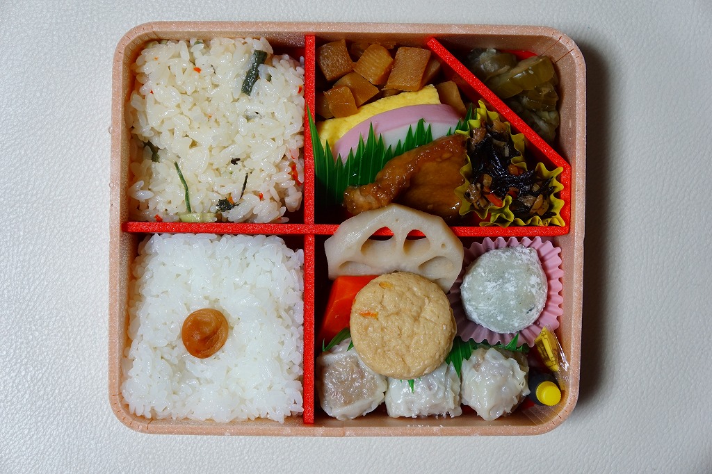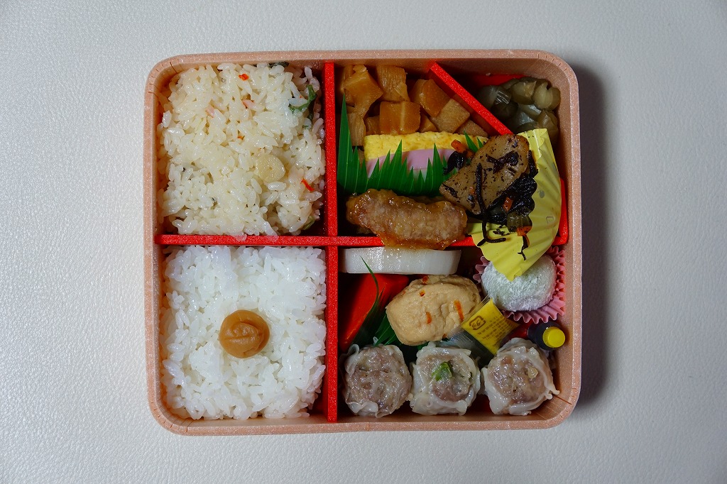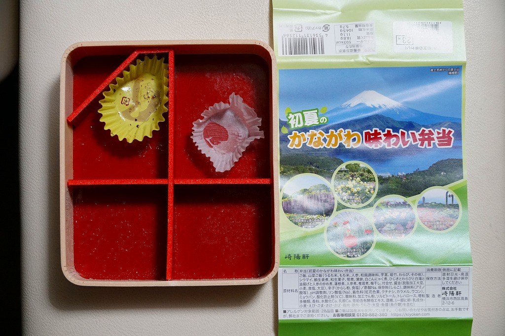 中身は昨初夏とほとんど同じ。三崎産マグロの生姜煮、三浦産芽ひじきとアサリなどの炒め煮、小田原蒲鉾、山菜御飯、小田原産梅干を使う日の丸御飯、きゅうりとみょうがの柴漬け、よもぎ大福、シウマイ3個などが入る。昨年と同じはずの「山菜ご飯」が油っぽい感じで、味の変化はあったと思う。
