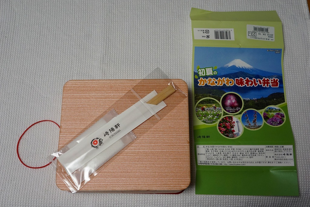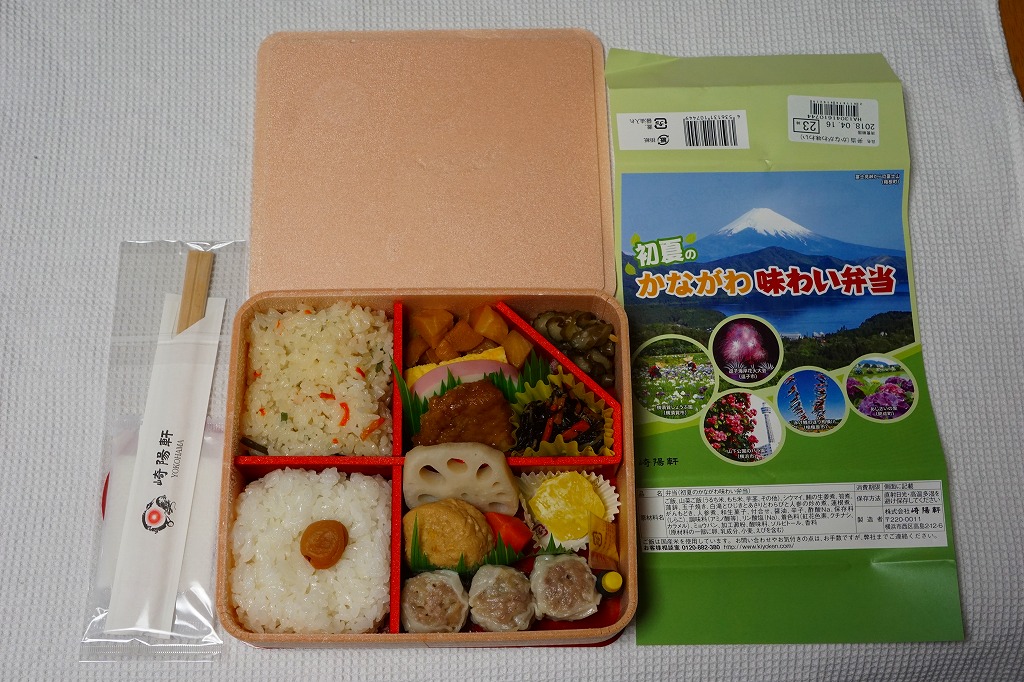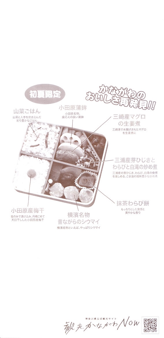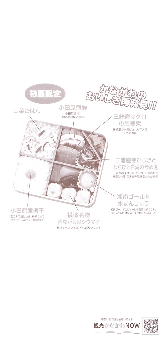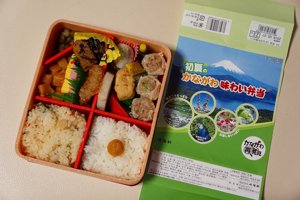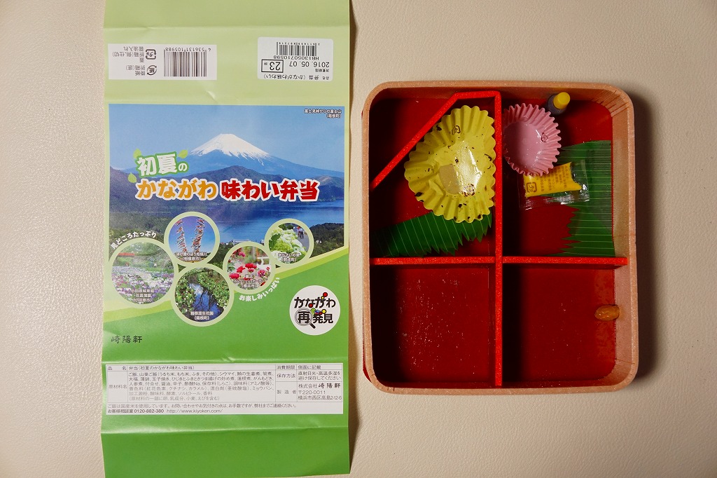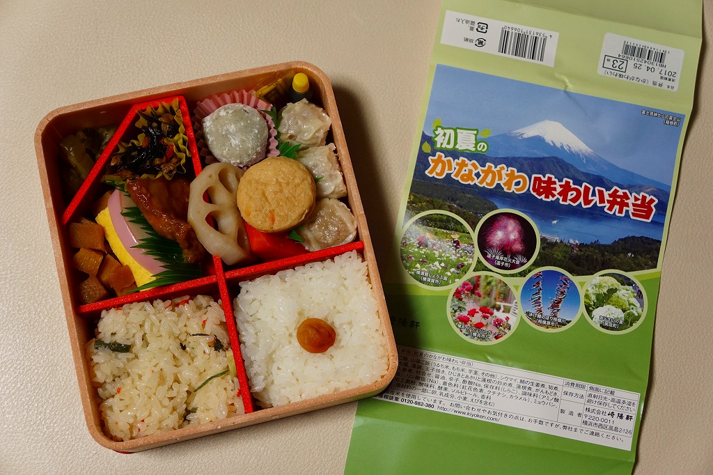 横浜駅弁「かながわ味わい弁当」では初登場の「初夏」版で、2016(平成28)年4月16日から6月15日までの販売。やはり神奈川県の「かながわ再発見キャンペーン」とのタイアップ企画とされる。掛紙の風景写真には、初夏の富士と神奈川県内の各種イベントが使われる。中身は今回も、小田原産梅干の日の丸御飯、山菜御飯、三崎産マグロ生姜煮、三浦産芽ひじきとふきと薩摩揚の炒め煮、小田原蒲鉾、よもぎ大福、しば漬、昔ながらのシウマイ3個などと、他の季節とだいたい同じ。