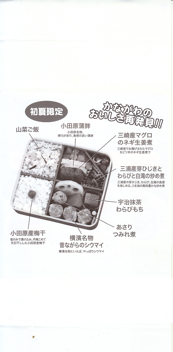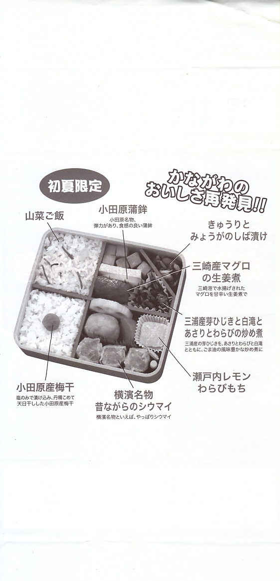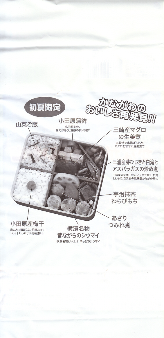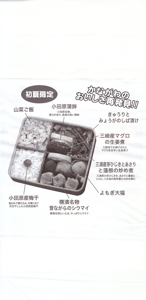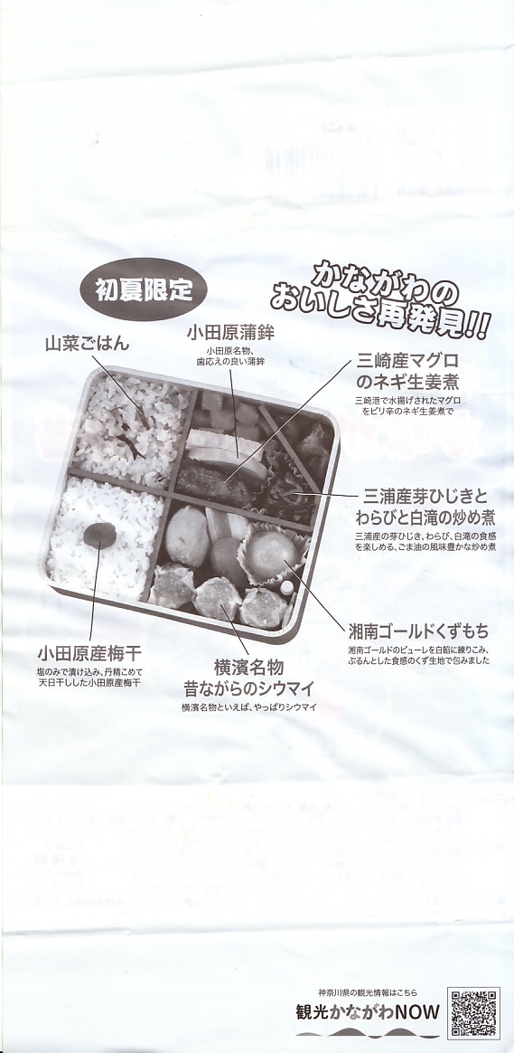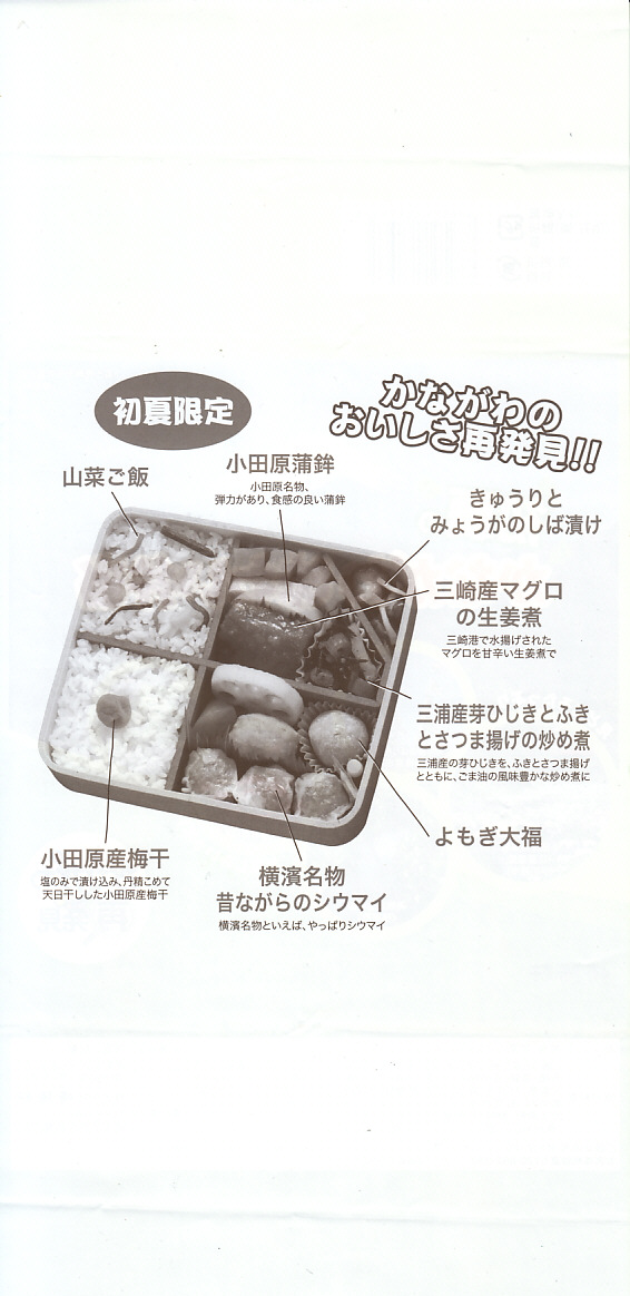 2008(平成20)年に発売された「かながわ味わい弁当」の、2016(平成28)年から出ている「初夏」版の9シーズン目で、2024(令和6)年4月16日から6月15日までの販売で、やはり神奈川県とのタイアップ企画。初夏版の発売当時から変わらない形の、初夏の風景でできている掛紙は、4年連続で据え置かれた。