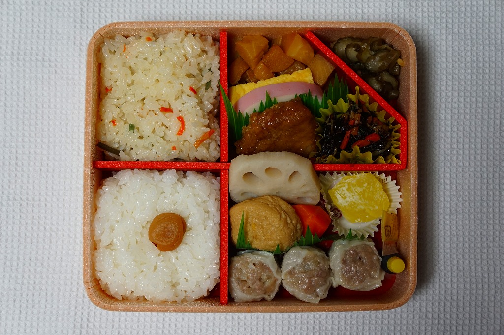 中身は昨初夏と、だいたい同じ。三崎産マグロの生姜煮、三浦産芽ひじきとわらびと白滝の炒め煮、小田原蒲鉾、山菜ごはん、小田原産梅干を使う日の丸御飯、湘南ゴールド水まんじゅう、シウマイ3個などが入る。価格は50円上がり、千円の大台を超えた。
