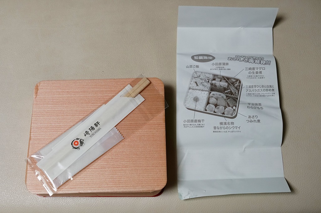 中身も昨初夏とほぼ同じ。三崎産マグロの生姜煮、三浦産芽ひじきとわらびと白滝の炒め煮、小田原蒲鉾、山菜ごはん、小田原産梅干を使う日の丸御飯、抹茶わらび餅、昔ながらのシウマイ3個などが入る。価格は60円上がった。