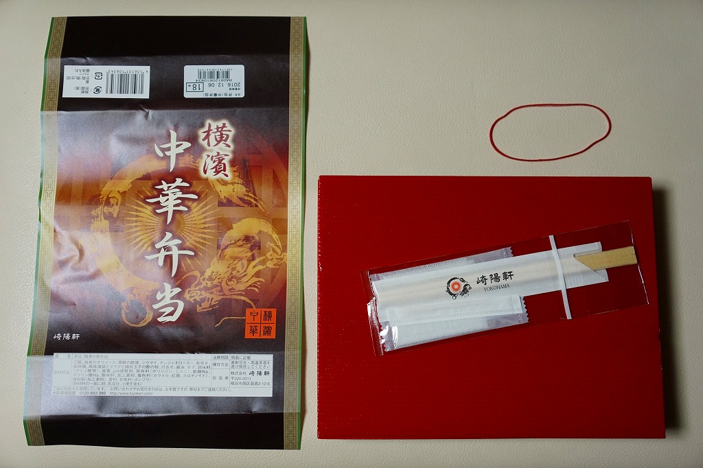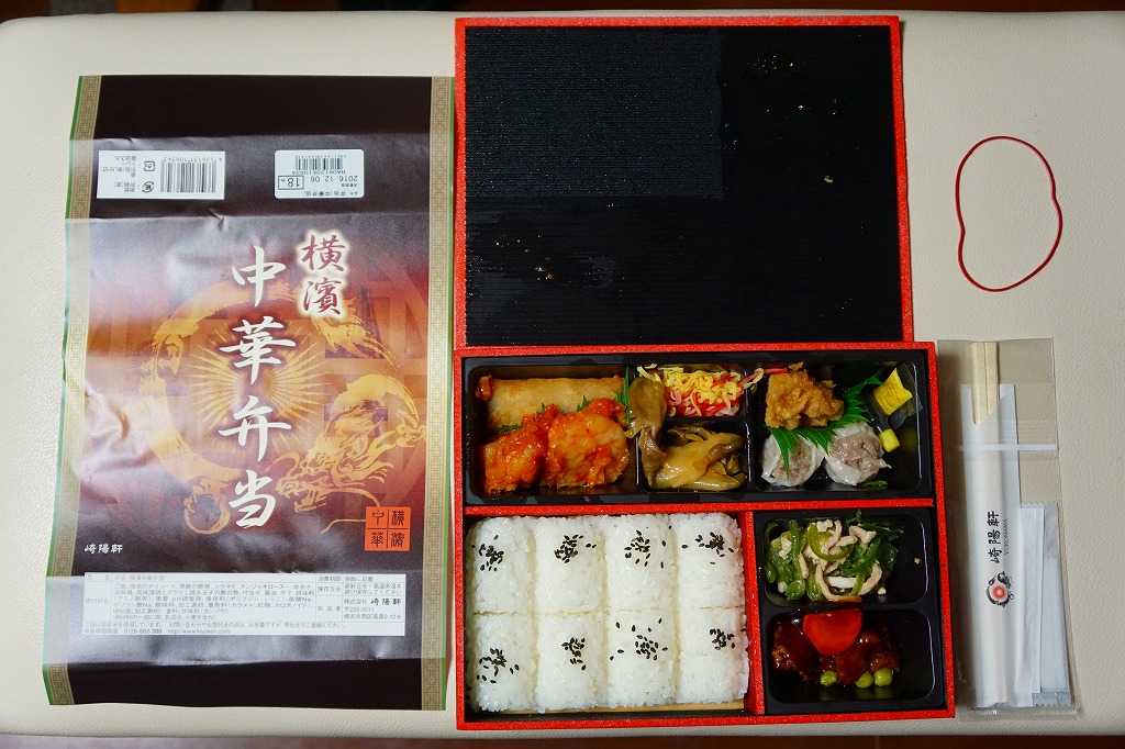 従前の横浜駅弁「横濱中華弁当」を、2014(平成26)年8月1日にリニューアル。中身は俵型に型押しした白御飯、エビチリ、酢豚、チンジャオロース(細切り肉野菜炒め)、ナスと鶏挽肉の炒め物、鶏肉揚、春巻、ザーサイ、クラゲとカニカマと錦糸卵の酢の物、特製シウマイ。黒い容器が赤くなり、掛紙が黒くなり、白御飯が俵型になり、メインでない具がちょっと入れ替わっただけ。あまり変わらないが、これがよい。
