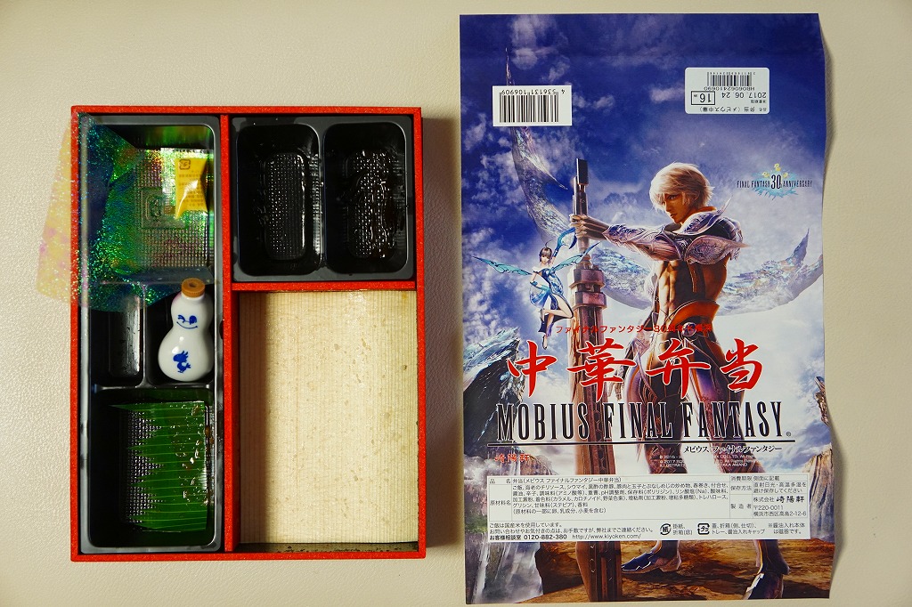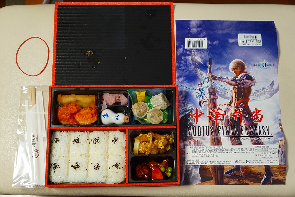 容器と中身と価格は、横浜駅弁「横浜中華弁当」とほぼ同じ。いくつかの具を抜き、シウマイを1個増の3個にして、ゲームキャラクター柄の磁器の醤油入れ「ひょうちゃん」を入れたもの。味もやはり、横浜中華弁当と同じ。選べる掛紙が「ブレイブエクスヴィアス」とこの「メビウス」の2種類、選べないひょうちゃんが「チョコボ」とこの「モーグリ」の2種類。