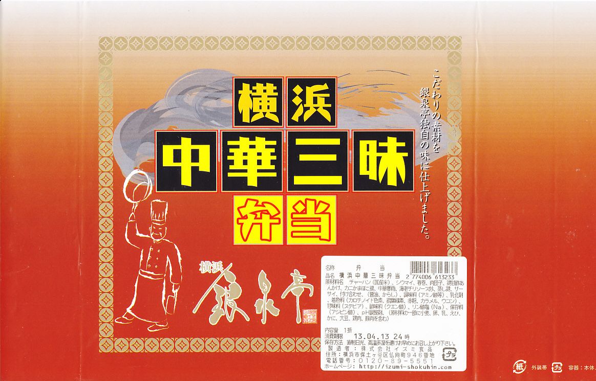 上記の弁当の2013(平成25)年4月時点での姿だと思われる。この頃には横浜駅やその周辺では買えなくなっていたと思うが、こうやってJRCPの駅弁売店では買えた。新横浜駅でも売られていた模様。容器は市販の仕出し弁当向けボール紙製容器に掛紙をかけるタイプに変更、中身はチャーハン、焼売、春巻、肉団子、鶏甘酢あんかけ、カニかまぼこ揚、中華春雨、エビチリ、蒸し鶏、ザーサイなどで、これはほぼ変わらない。価格も同じ。2015年頃までの販売か。