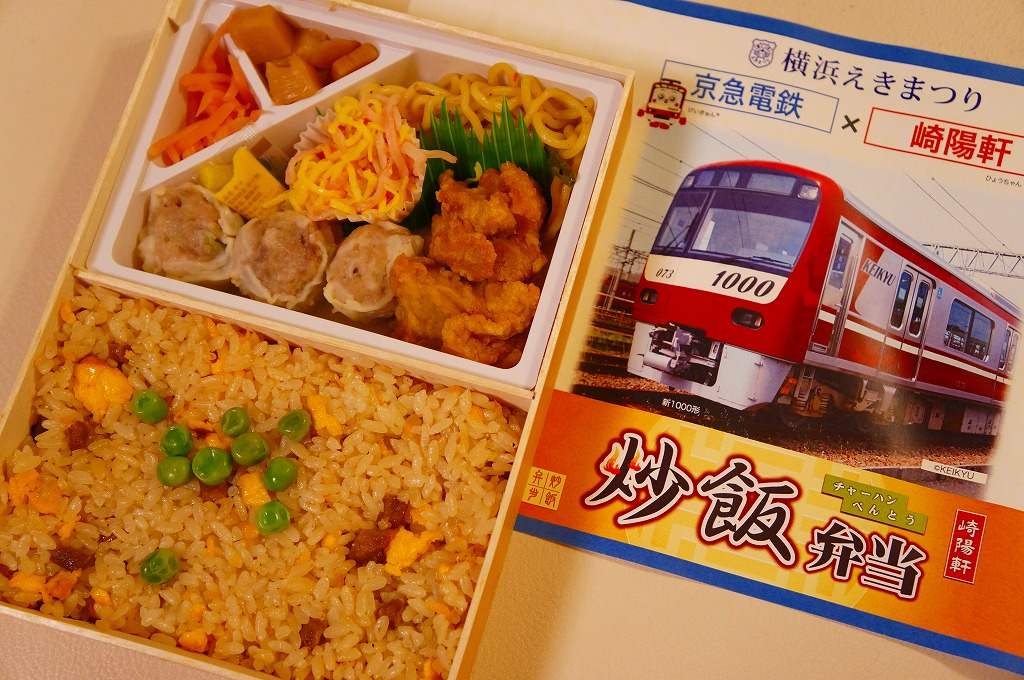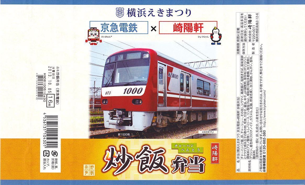 写真の車両は、2014(平成26)年5月デビューの黄色い新1000形電車「KEIKYU YELLOW HAPPY TRAIN」。黄色い電動貨車を見たら幸せになれるという、おそらく東海道・山陽新幹線の新幹線電気軌道総合試験車「ドクターイエロー」のそれに端を発すると思われる噂に基づき、普段は赤い電車のうち1本に黄色い塗装を施したもの。1本だけなのでなかなか見られないが、京急の公式サイトで時刻表が公開されているため、狙い撃ちができる。掛紙以外は通常の「炒飯弁当」と同じ。