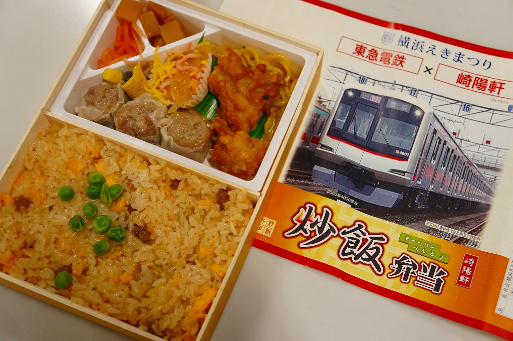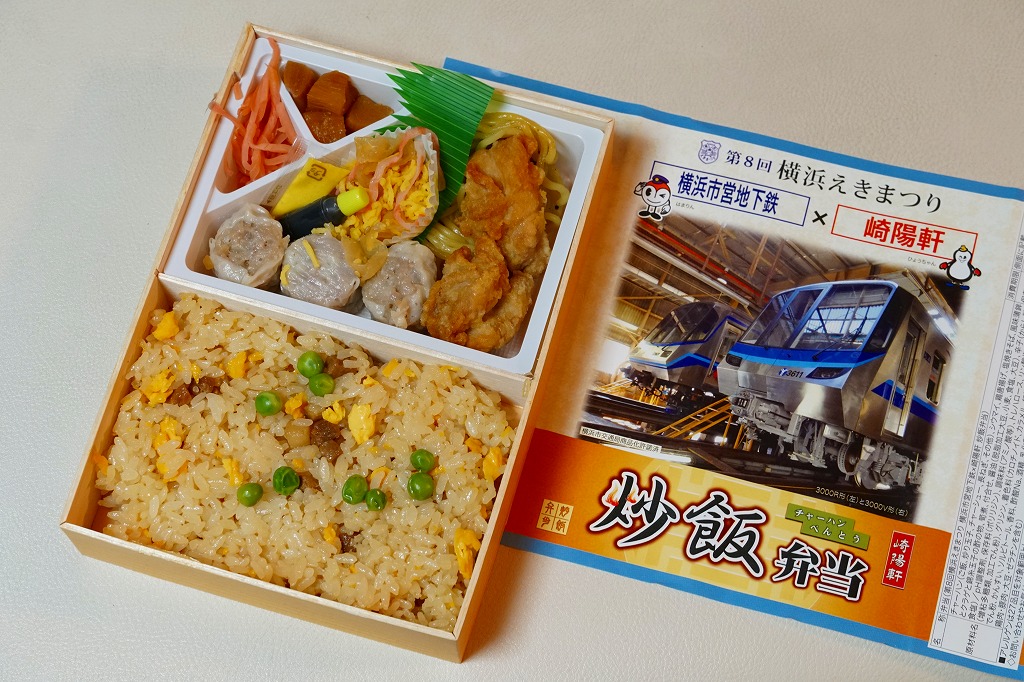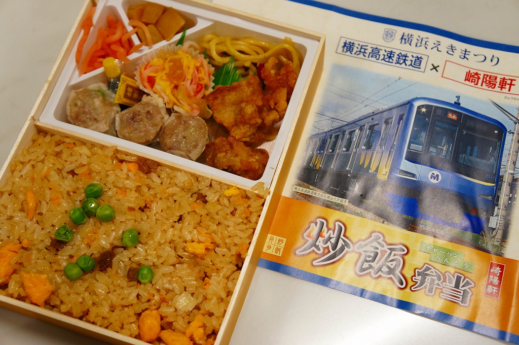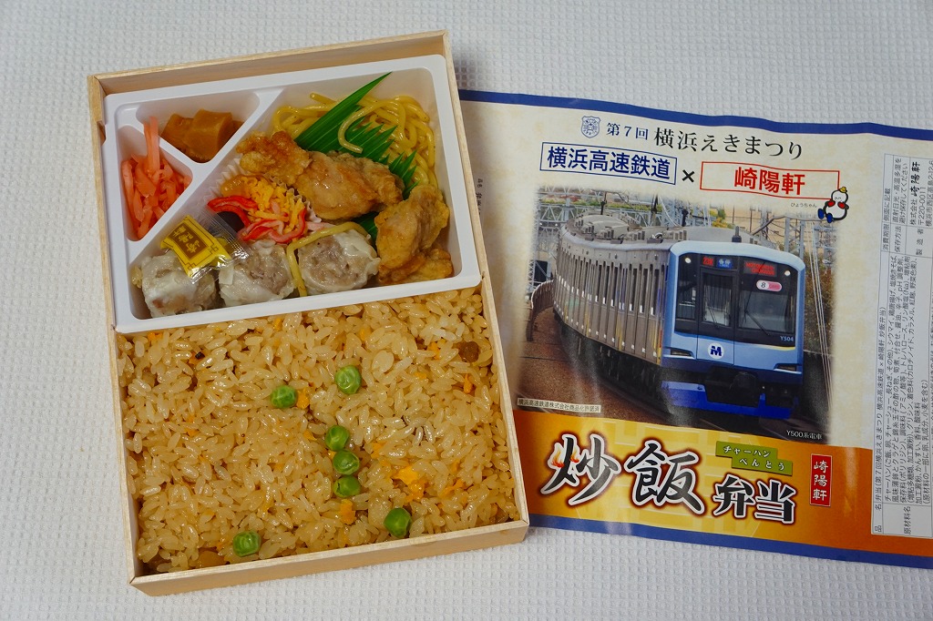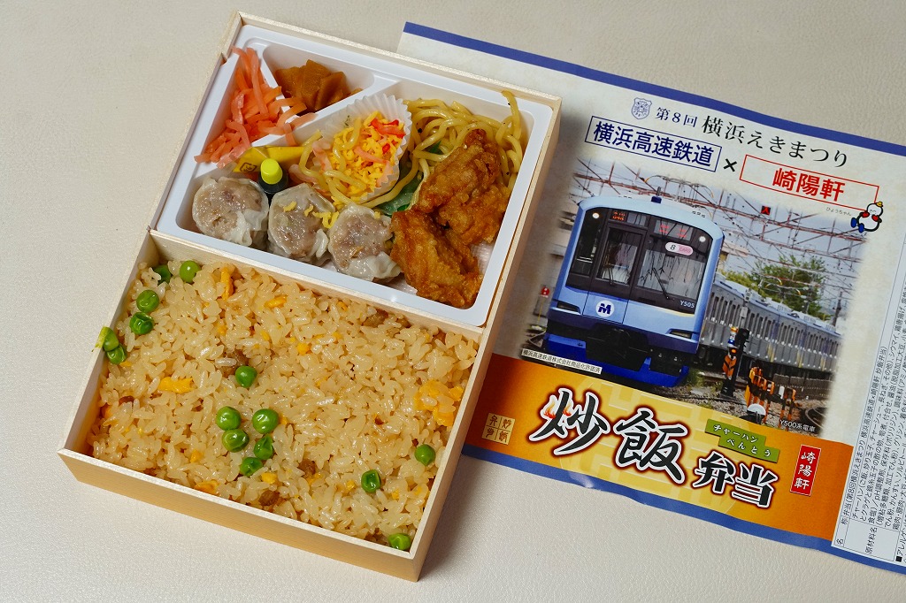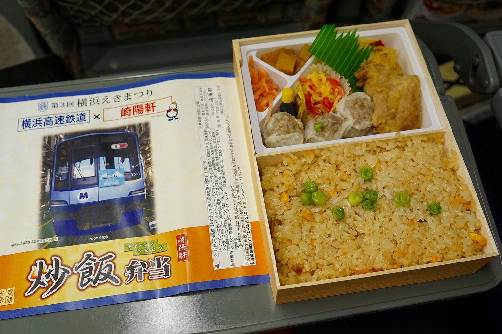 写真の電車は、Y500系電車。引き続き横浜高速鉄道の電車は、2004(平成16)年2月の開業からこのタイプのみ。開業10周年のヘッドマークが取り付けられている。掛紙以外は通常の「炒飯弁当」と同じ。
