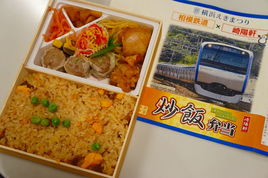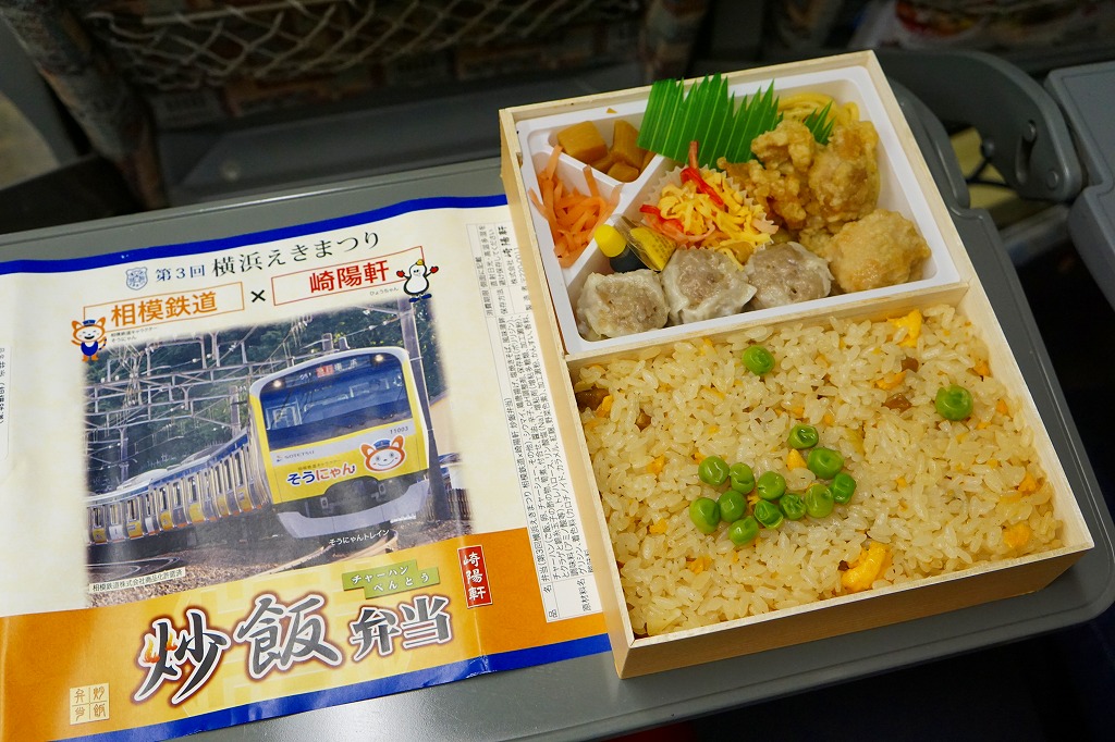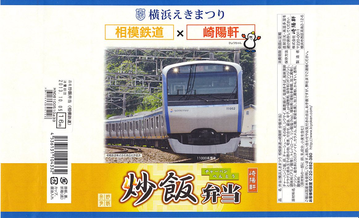 写真の電車は、2014(平成26)年5月デビューの11000系電車「そうにゃんトレイン」。前月に登場した相鉄のゆるキャラ「そうにゃん」のラッピング電車である。タヌキに見えるが、ネコのキャラクター。掛紙以外は通常の「炒飯弁当」と同じ。
