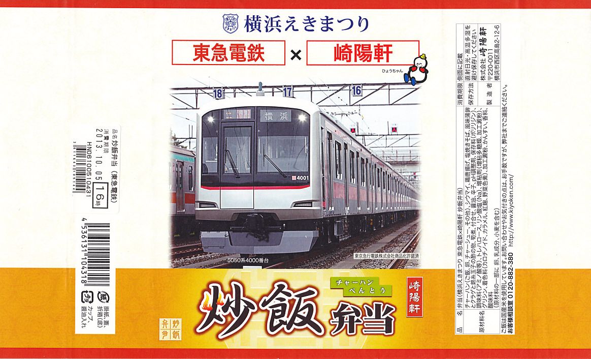 2013(平成25)年10月5日の調製である、横浜駅弁の掛紙。2013年10月4日から14日までの「第2回横浜えきまつり」の開催に合わせて、横浜駅に乗り入れる鉄道会社6社それぞれの電車を掛紙にしたバージョンの、東急電鉄版。