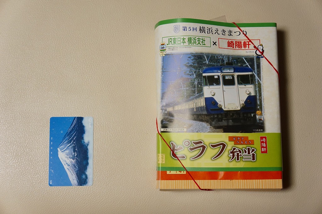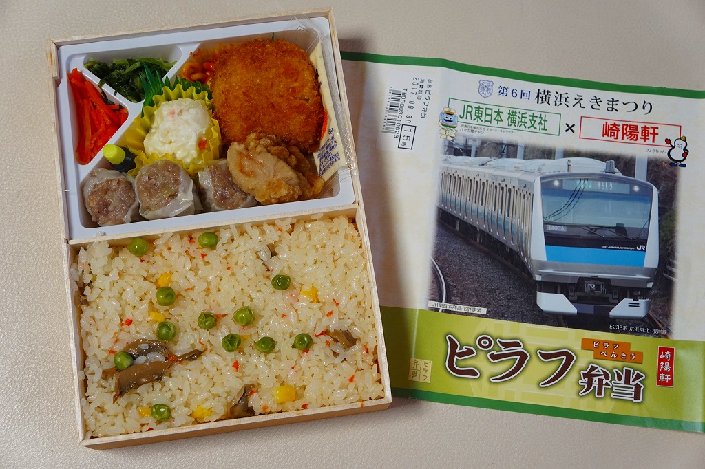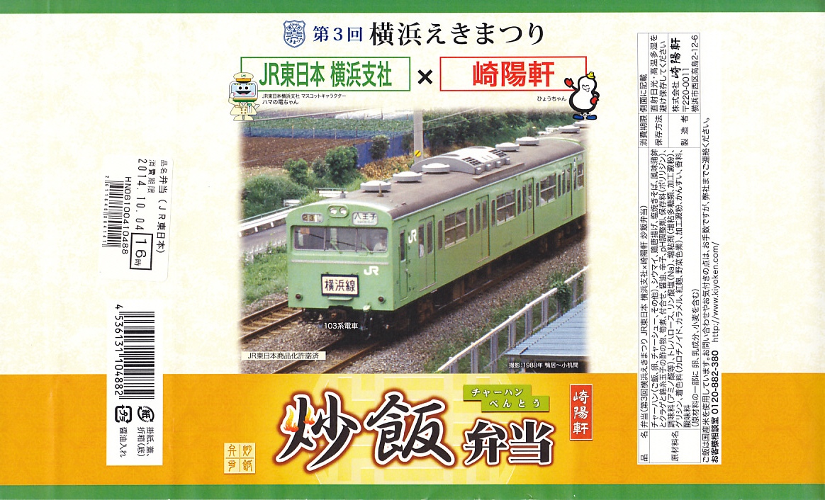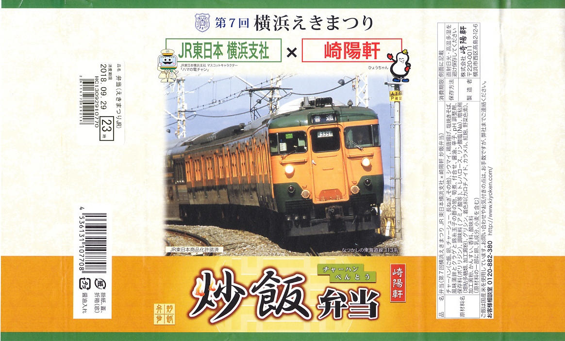 2013(平成25)年10月5日の調製である、横浜駅弁の掛紙。2013年10月4日から14日までの「第2回横浜えきまつり」の開催に合わせて、横浜駅に乗り入れる鉄道会社6社それぞれの電車を掛紙にしたバージョンの、JR東日本版。1963年から2006年3月まで東海道本線で運行されていた113系電車の写真を使う。中身は通常の「炒飯弁当」と同じ。