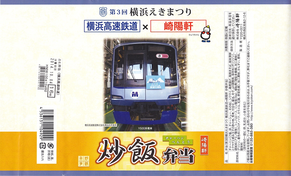 2014(平成26)年10月4日の調製である、横浜駅弁の掛紙。2014年10月4日から14日までの「第3回横浜えきまつり」の開催に合わせて、横浜駅に乗り入れる鉄道会社6社それぞれの電車を掛紙にしたバージョンの、横浜高速鉄道版。
