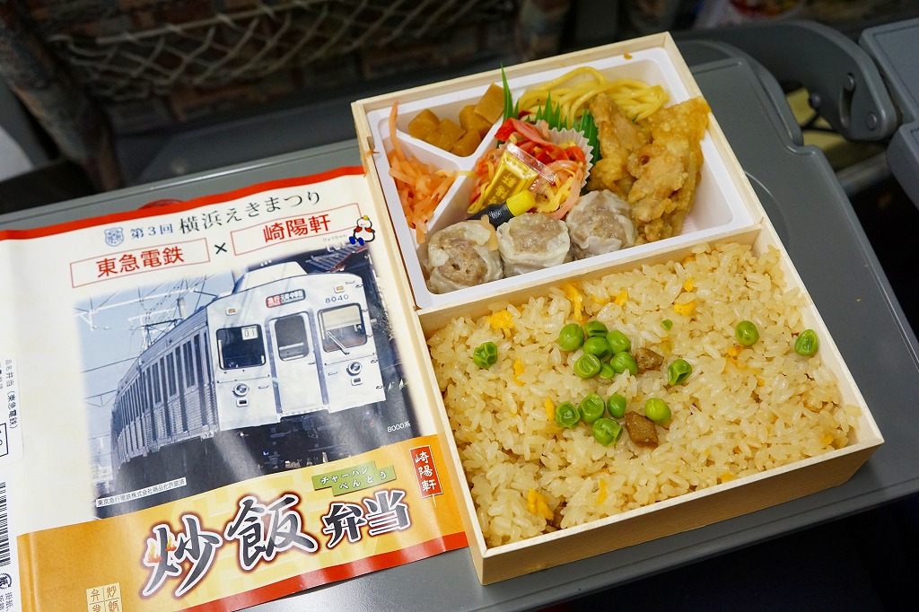 写真の車両は、1969(昭和44)年11月から2008(平成20)年1月まで東横線で運用されていた8000系電車。東急初の20m車(1両あたりの長さが約20メートル)として輸送力の増強に貢献した。写真の編成は、引退を前に1990年代の改修で加えられた赤や黒の装飾を撤去し、デビュー当時のステンレス地肌の銀色の姿に戻されたタイプ。掛紙以外は通常の「炒飯弁当」と同じ。