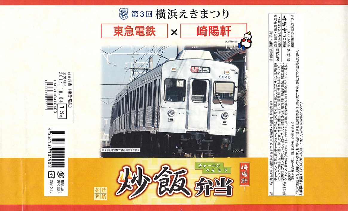 2014(平成26)年10月4日の調製である、横浜駅弁の掛紙。2014年10月4日から14日までの「第3回横浜えきまつり」の開催に合わせて、横浜駅に乗り入れる鉄道会社6社それぞれの電車を掛紙にしたバージョンの、東急電鉄版。