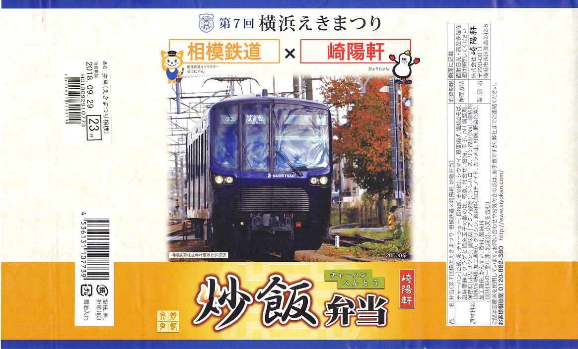 2018(平成30)年9月29日の調製である、横浜駅弁の掛紙。2018年9月29日から10月14日までの「第7回横浜えきまつり」の開催に合わせて、横浜駅に乗り入れる鉄道会社6社それぞれの電車を掛紙にしたバージョンの相模鉄道版で、期間中の土休日に横浜駅エリアで販売。