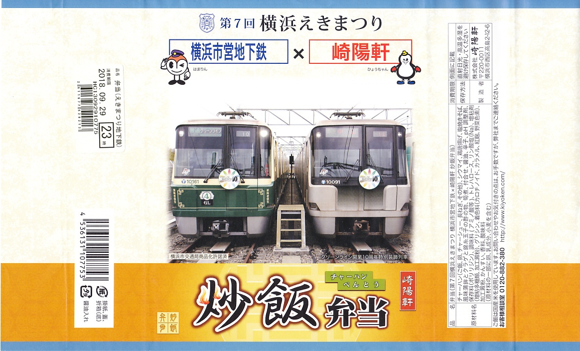 2018(平成30)年9月29日の調製である、横浜駅弁の掛紙。2018年9月29日から10月14日までの「第7回横浜えきまつり」の開催に合わせて、横浜駅に乗り入れる鉄道会社6社それぞれの電車を掛紙にしたバージョンの横浜市営地下鉄版で、期間中の土休日に横浜駅エリアで販売。