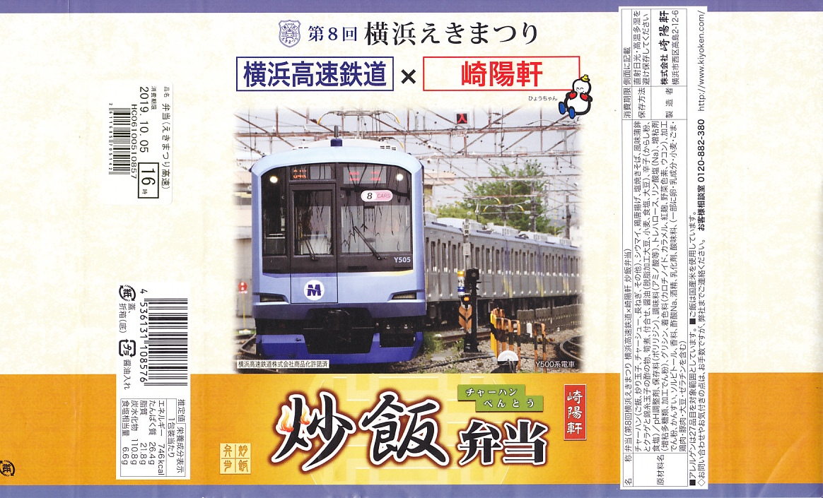 2019(令和元)年10月5日の調製である、横浜駅弁の掛紙。10月1日から14日までの「第8回横浜えきまつり」の開催に合わせて、横浜駅に乗り入れる鉄道会社6社それぞれの電車を掛紙にしたバージョンの横浜高速鉄道版で、期間中の土休日に横浜駅エリアで販売。