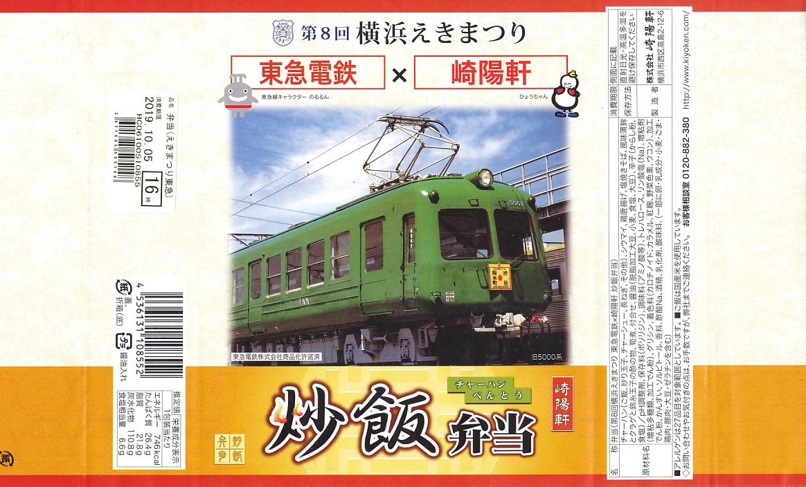 2019(令和元)年10月5日の調製である、横浜駅弁の掛紙。10月1日から14日までの「第8回横浜えきまつり」の開催に合わせて、横浜駅に乗り入れる鉄道会社6社それぞれの電車を掛紙にしたバージョンの東急電鉄版で、期間中の土休日に横浜駅エリアで販売。
