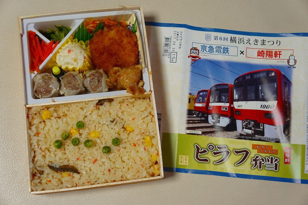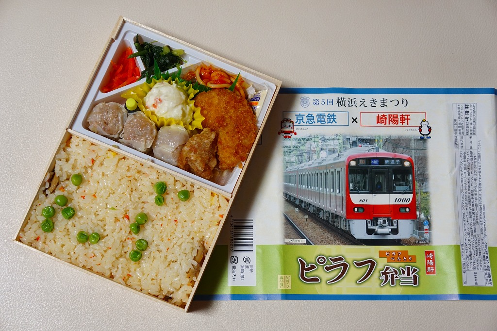 写真の車両は、2014(平成26)年5月デビューの黄色い新1000形電車「KEIKYU YELLOW HAPPY TRAIN」と、2005(平成17)年3月デビューの青い600形電車「KEIKYU BLUE SKY TRAIN」と、2013(平成25)年8月から更新工事が始まった赤い2100形電車。京急といえば赤い電車だが、羽田空港輸送のPRで青い電車が走り始め、後に「沿線に、幸せを運ぶ。」として事業用車両のような黄色い電車も走り始めた。掛紙以外は通常の「横濱ピラフ」と同じ。